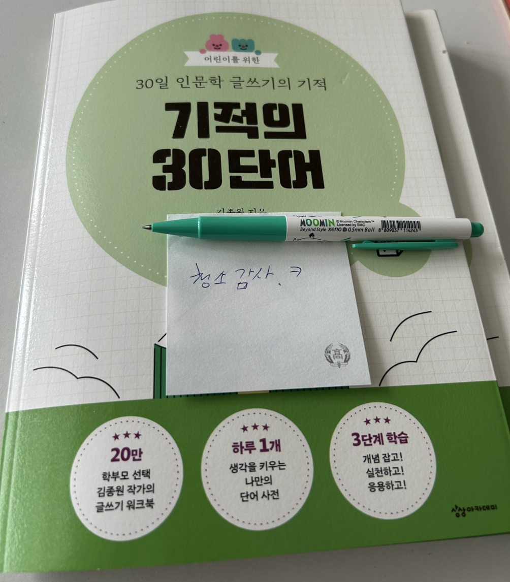 아들은 언제나 뒤를 정리할 줄 알아 이런 외출시 더욱 방안을 정리해두다보니 나는 아들을 생각하며 아들방을 쓸고 닦는 시간을 가질 수 있다. 아들이 새벽 6시 부터 밤 11시 가 지나도록 놀고 와 힘들지 않은 내색을 보니 내 맘이 놓인다.그리고 다음날 필사본을 보며 잠시 멈춘다. 이게 뭐지? 인문학 워크북인 기적의 30단어 앞에 붙여놓은 아들의 메모에는 청소해 줘서 감사하다는 아들이 느낀 이런 마음의 표현과 느낌에 미소의 바람이 불어온다.