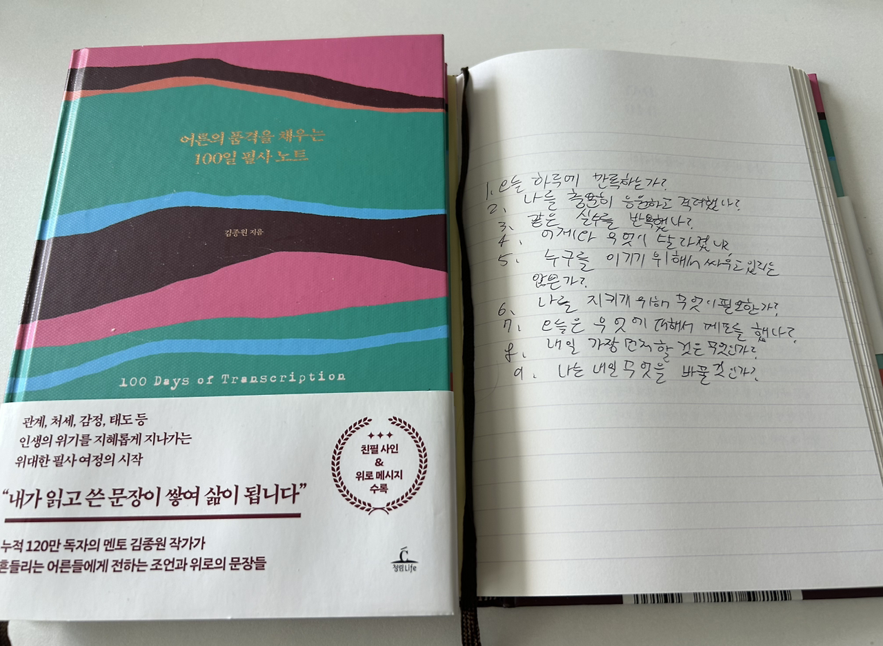 나이가 더 들기전에 어떤 책이든 특히 인문학 전통이 깃든 김종원 작가님저서 글과 책을 읽어가며 따라 쓰기를 해보라. 고 이어령 박사님의 마지막이자 길이 남겨진 생전 모습이 아름다운 이유는 나이들괴 아프고 힘들 때 나를 지탱하고 견디게 해주는 힘이 바로 지성이자 지력이기 때문이다. 그건 배움과 신분을 떠나 오직 나로서 나를 안아줄 수 있는 품격있는 죽음을 맞이할 내게 주는 큰 답이자 선물이라서 그렇다.