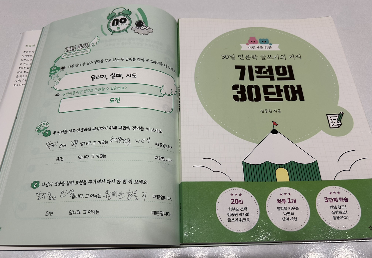 김종원 작가님 저서 인문학 워크북 시리즈 인 ‘기적의 30 단어’의 주제와 질문을 따라가는 중3 둘째의 글을 보며 내 마음이 화사해진다.