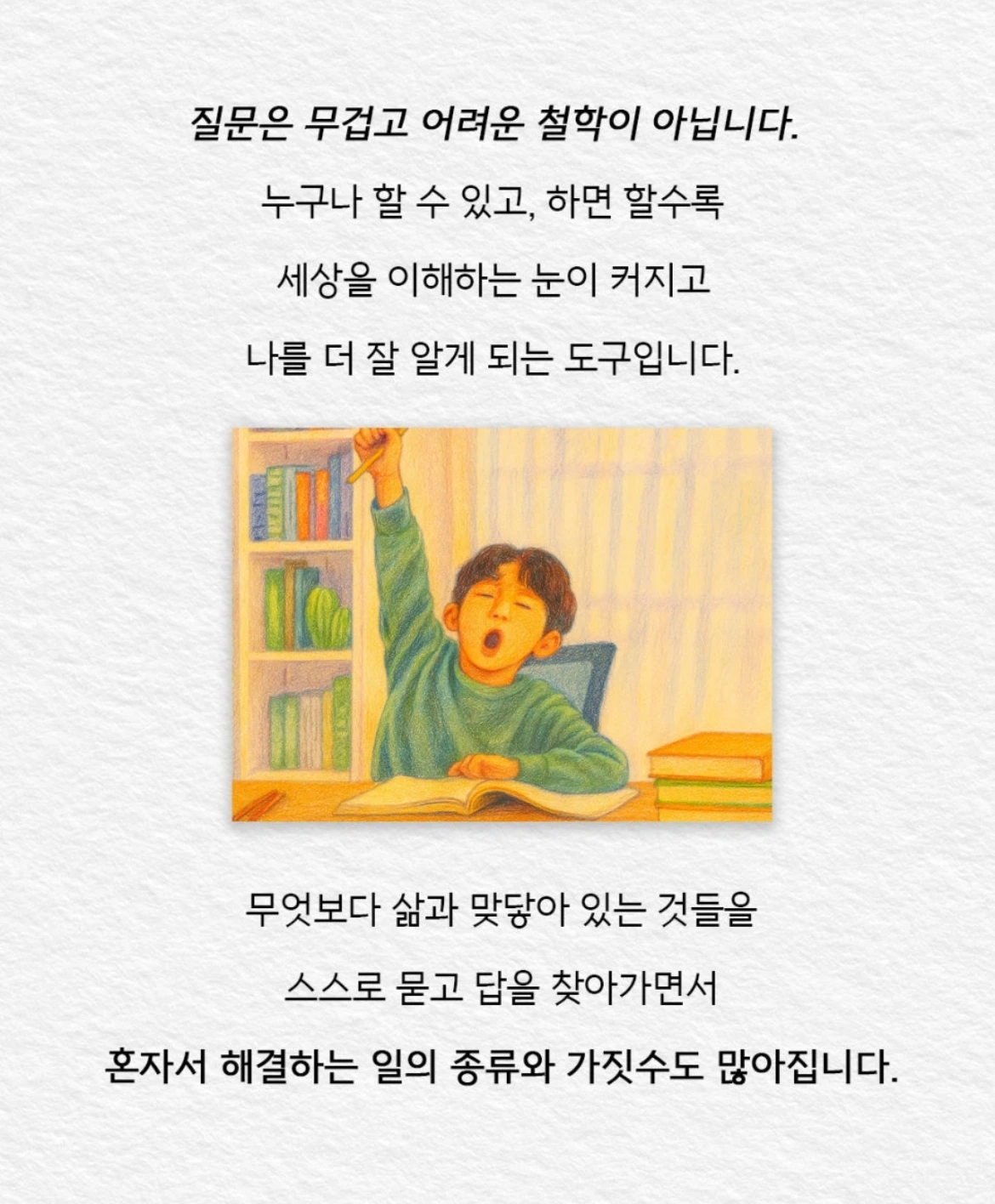 질문은 무겁고 어려운 철학이 아닙니다. 누구나 할 수 있고, 하면 할수록 세상을 이해하는 눈이 커지고 나...