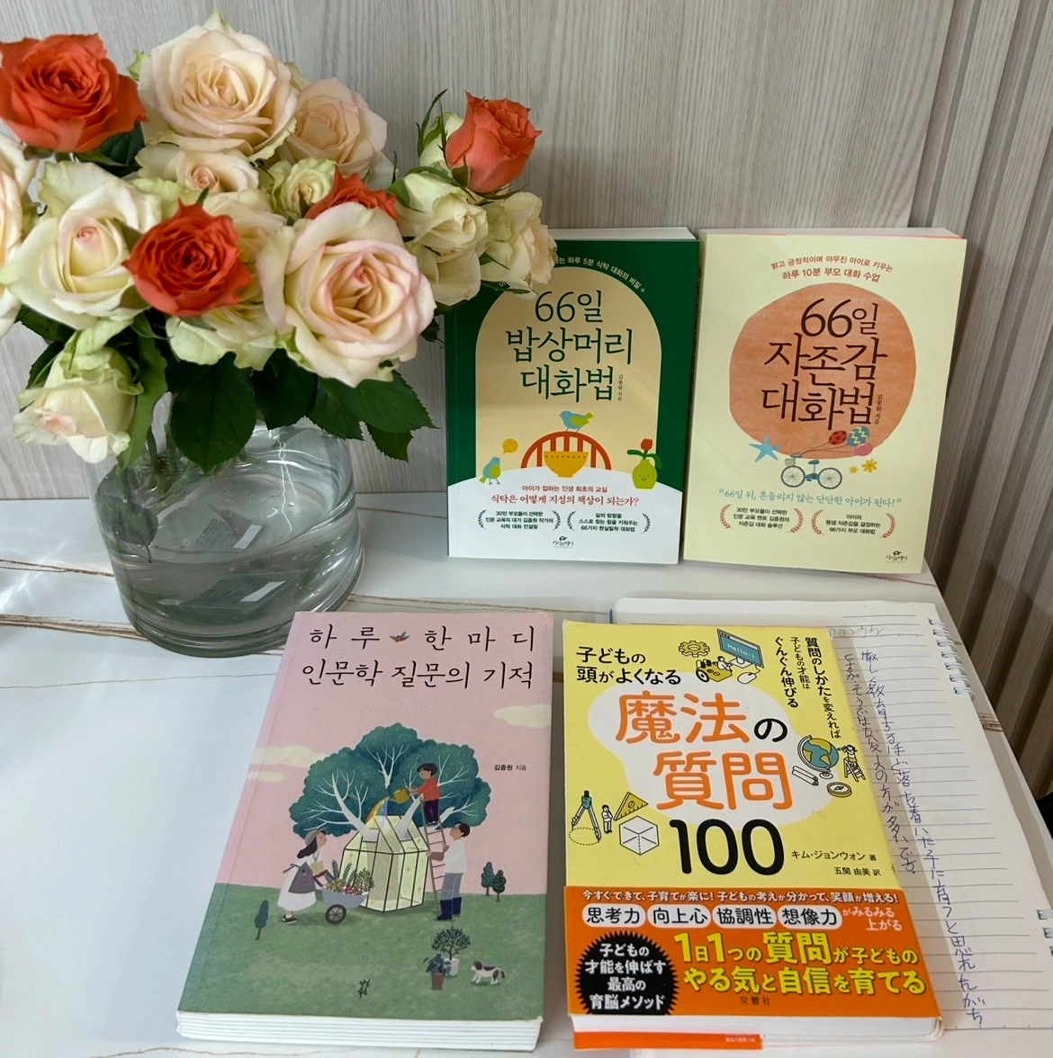 글과 사색 전통 30년의 눈물 어린 사랑을 실은 지성 김종원 작가님이 출간하신 90 권 이상의 책중에서 소장 중인 55권의 책중에서 매일 자녀와 돌아가며 7~8,9의 책을 읽고서 노트에 적으며 따라 쓰거나 생각을 쓰는 필사를 실천 중이다. 그중 하루 한마디 인문학 질문의 기적 일본판을 구할 수 있는 건 일본을 왕래하는 언니네조카들 덕분에 이토록 귀한 해외 책을 들고서 볼 수 있는 거니까.