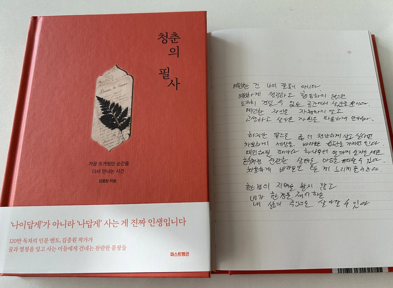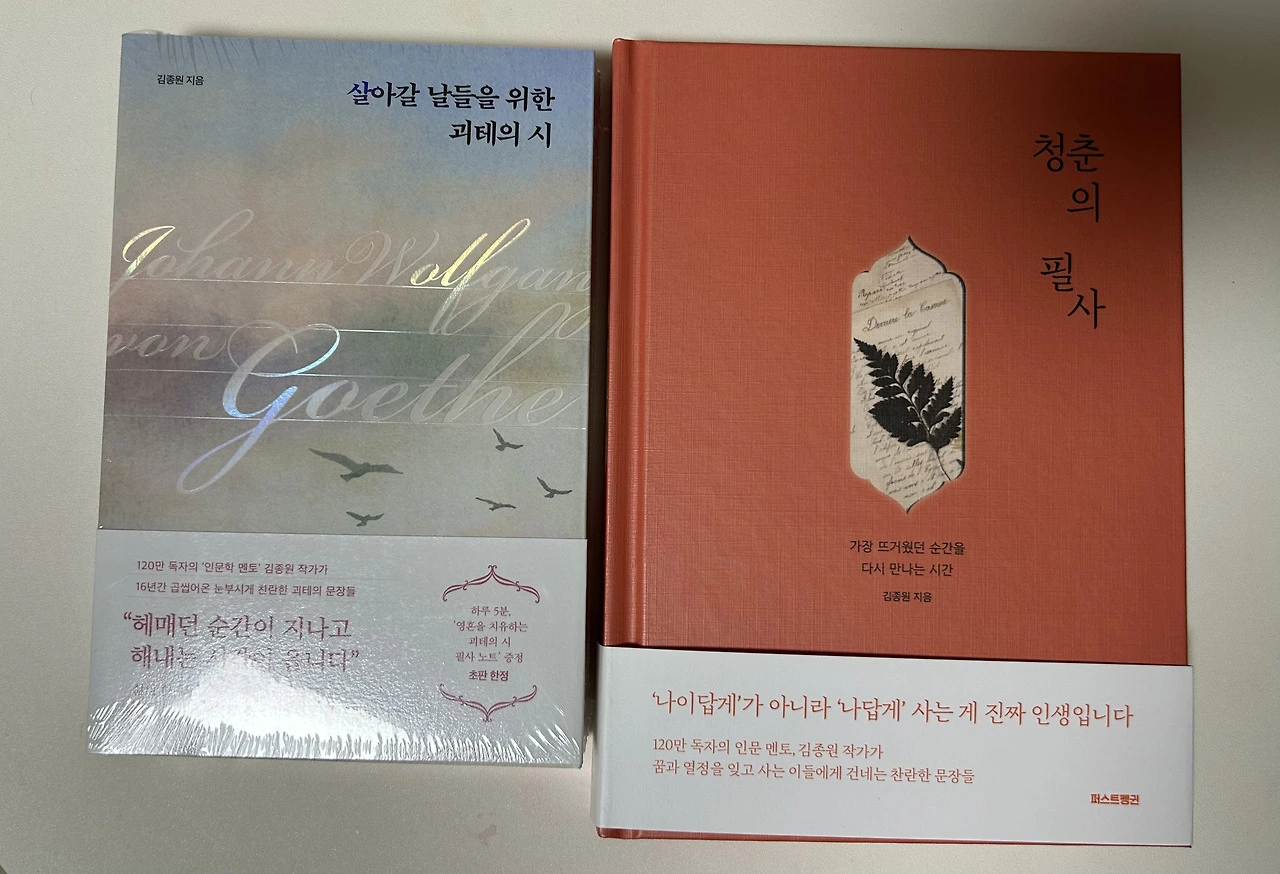 언제든 주문하면 바로 내 줄 수 있는 일상 일소에서 언제든 한분의 다양한 책이 진열된 독립 서점을 차린 것같은 애틋한 기분이 들어 좋았다. 딸 애가 내년 교생 실습을 나간다는 예정에 대화를 가끔 나누곤 하는데 대학에서도 교생 실습을 나가기도 하는지 실습나온 대학생에게 전해 줄 청춘의 필사 와 살아갈 날들을 위한 괴테의시 2권의 책을 책장에서 꺼내 담아 본다.