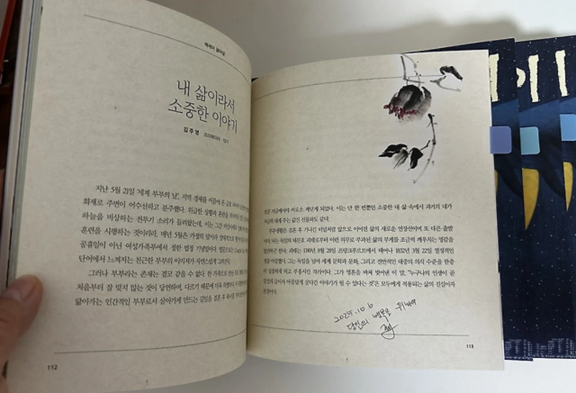 “엄마 글 나오는 지면에 포스트 잇으로 구분해 놓으면 좋겠어요. 아! 참 엄마 친필 사인도 해서 드림 더 좋을것 같아요”