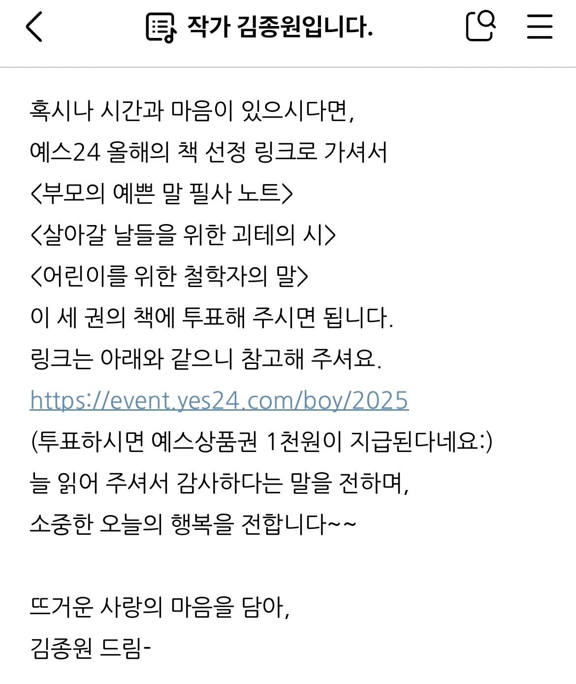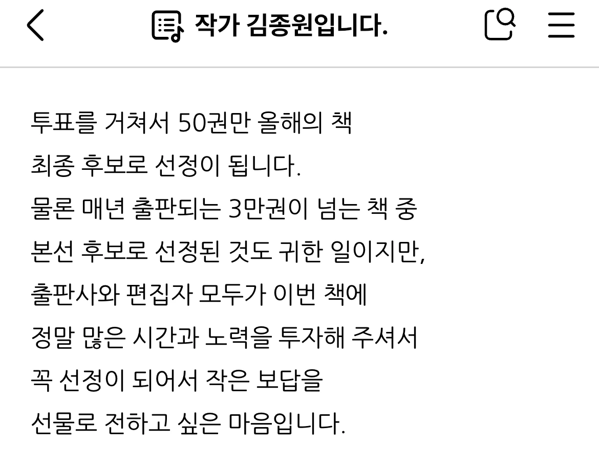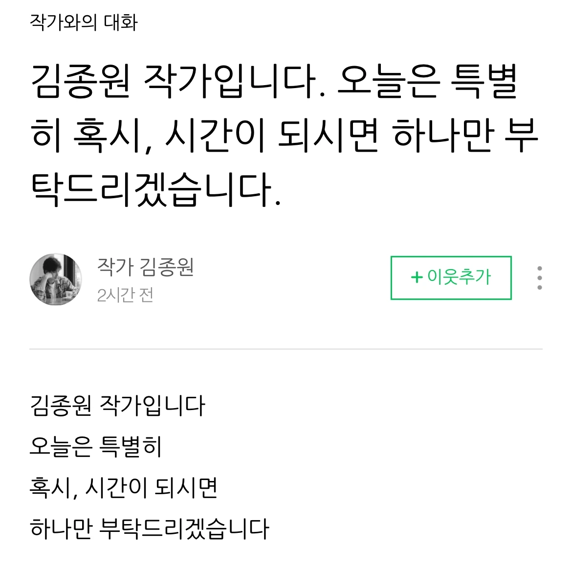 김종원 작가입니다. 오늘은 특별히 혹시, 시간이 되시면 하나만 부탁드리겠습니다.