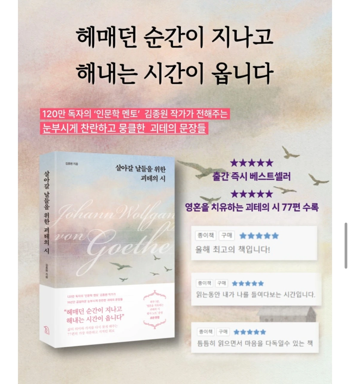 120만 독자가 택한 대한민국 대표 인문학 멘토이자 필사 멘토, 김종원이 선택한 철학의 질문으로 내면을 채우는 필사 노트. 괴테, 니체, 비트겐슈타인 세 명의 철학자들의 말에서 길어 올린 삶을