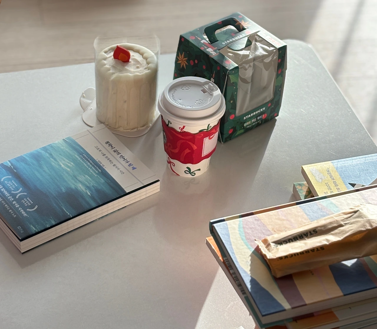 병원 다녀오는 길에 아이가 만난 세계를 표현하듯 아이 두 손에 든 미니케잌과 따뜻한 카푸치노 한잔을 배달하느라 가득했다.