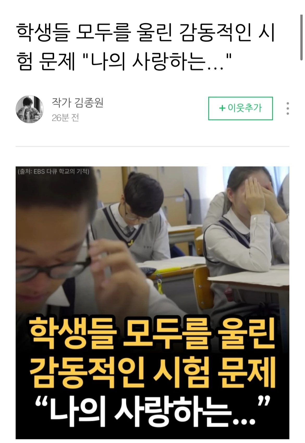 학생들 모두를 울린 감동적인 시험 문제 나의 사랑하는