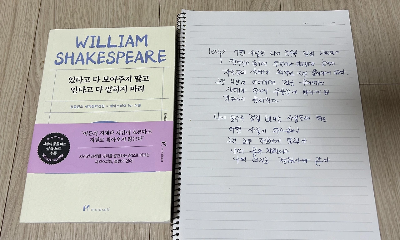 끝날 때까지 끝이 없을 부모님의 건강앞에 온가족의 날듵이 달라지는 일상앞에서도 결코 쓰러지지 않고 나아가는 자녀의 날이 찾아온다. 그래서 서른 마흔을 보내고 좋은 글과 문장을 보고 읽고 쓰고 실천하는 필사적인 시간이 나를 다시 살게 하는 힘을 내게 한다.