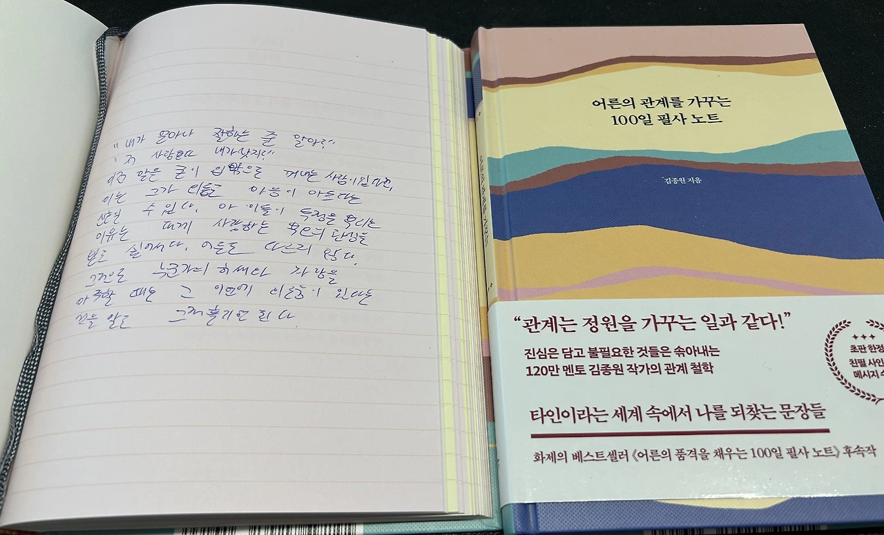 아이가 쓴 <어른의 관계를 가꾸는 100일 필사 노트> 필사 허세 뒤에 숨은 외로움 필사 페이지 문장길도 함께 걷는다.살다보면 그저 흘릴 수 없을 때가 있다 그 사이에 숨겨진 뜻을 이해하기에 나의 내면과 정서의 다름도 관계가 있으니까. 그러나 내적 질문을 오래하며 본질을 꿰뚫어 풀어가는 시기가 오니 그게 바로 성장이며 오늘하루 내가 보낸 지적 시간의 합이 그 길로 초대한다.