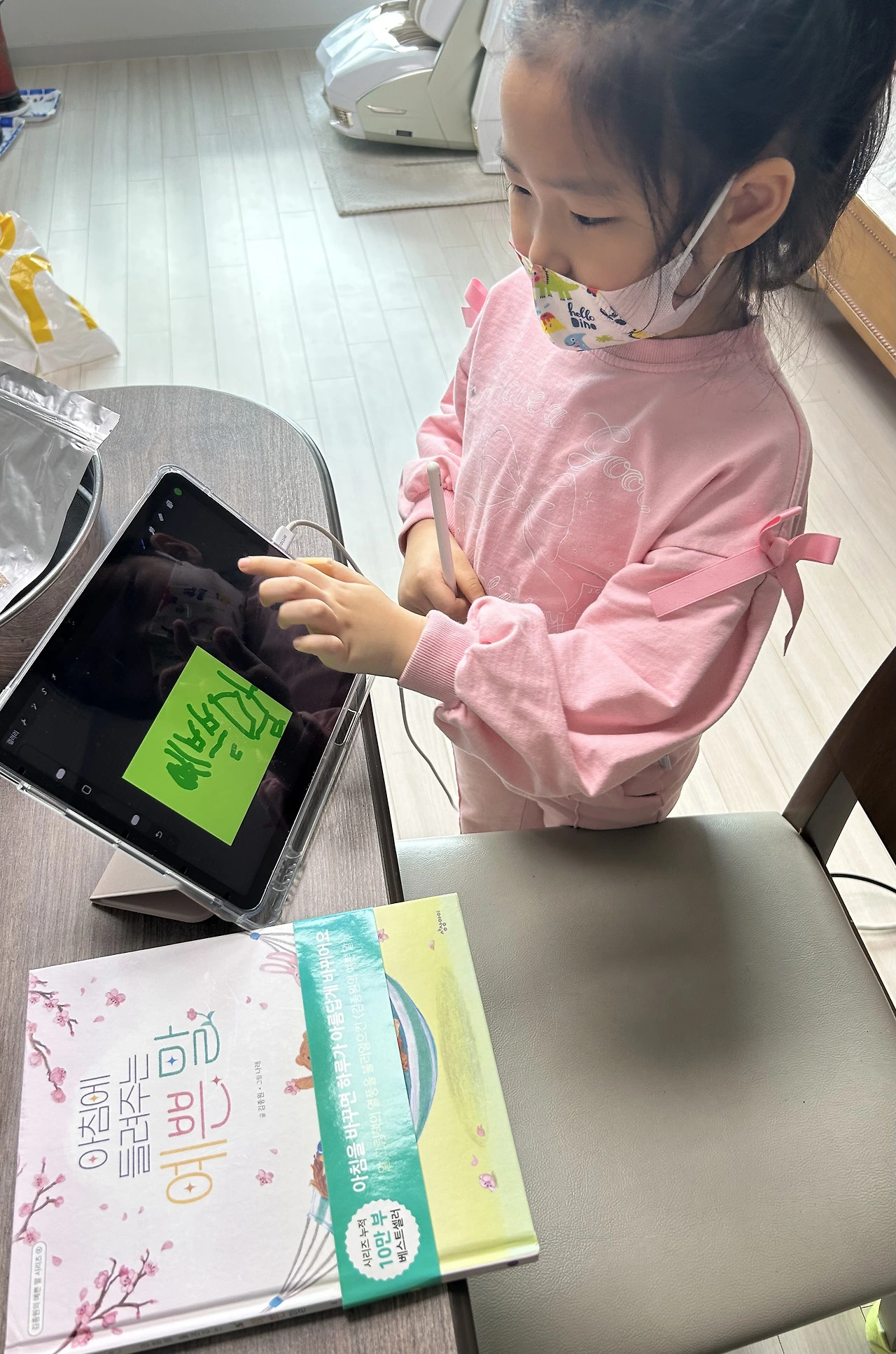 그래도 긴 시간동안 지루하지 않고 즐겁게 보낸 건 6세 꼬마 덕분이었다. 조카 손녀의 놀이 세상과 (공룡 피규어, 그림 그리기, 색칠공부, 게임, 알파벳, 숫자공부등) 새로운 단어의 표현을 하는 아이가 기기를 다루는 능숙한 손놀림과 재치에 내가 잘 하지 못하는 걸 아이는 하고 있네. 패드 화면으로 동화책 제목에 쓰인 글을 필사하고 그림을 부르며 노래도 부르고 곧 이모 할머니와 함께 하는 인문학 글을 읊으며 낭송을 시작한다.