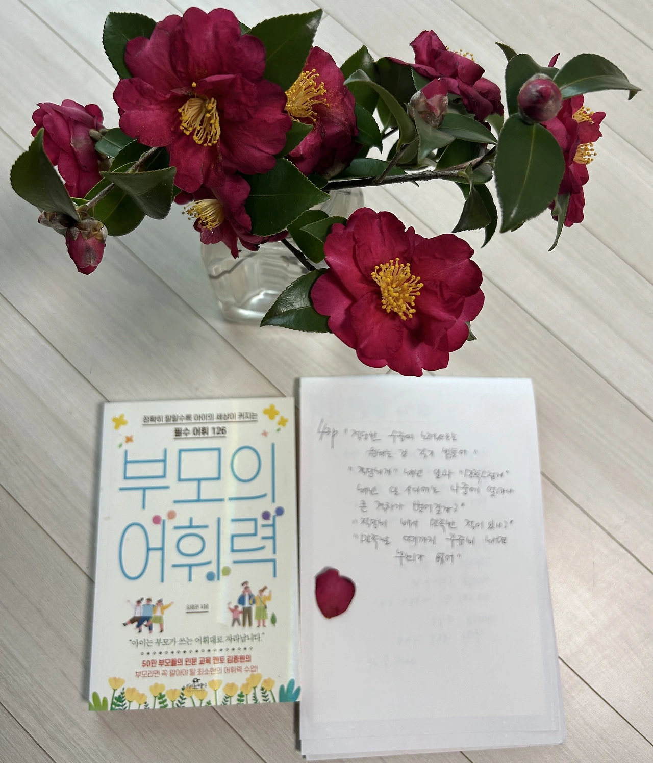 암과의 전쟁에서 살아남을 수 있는 2가지 운동과 수분섭취가 중요하다는 말에 듣고도 알면서도 기력이 허해등지고 누운 자리에서 일어나 우리가 집으로 가고 엄마 혼자서 집부근을 힘들게 산책하며 장식해둔 겨울에피어나니 더욱 생명력이 진한 동백꽃 화병아래 내가 필사한 노트와 책과의 조화는 언제나 향긋 하니까.