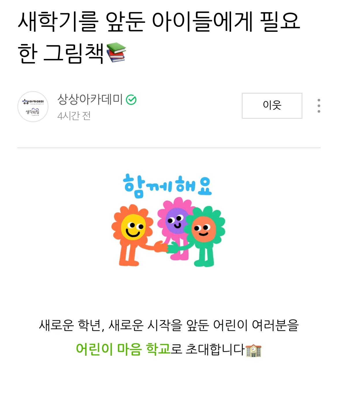 새로운 학년, 새로운 시작을 앞둔 어린이 여러분을 어린이 마음 학교로 초대합니다� ���1교시 ...