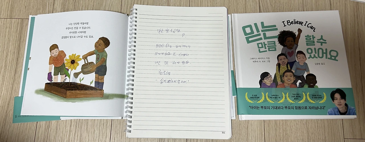 아들은 요즘 믿는 만큼 할 수 있어요 지금 있는 그대 충분해 미국 그림 동화책에서 한 줄을 읽고 문장을 더 꺼내 쓰는 재주가 있다. 이 녀석 긴 글에는 짧게 말하고 함축된 글의 문장에서는 글을 더 길게 쓰는 걸 보니 반가워지네.