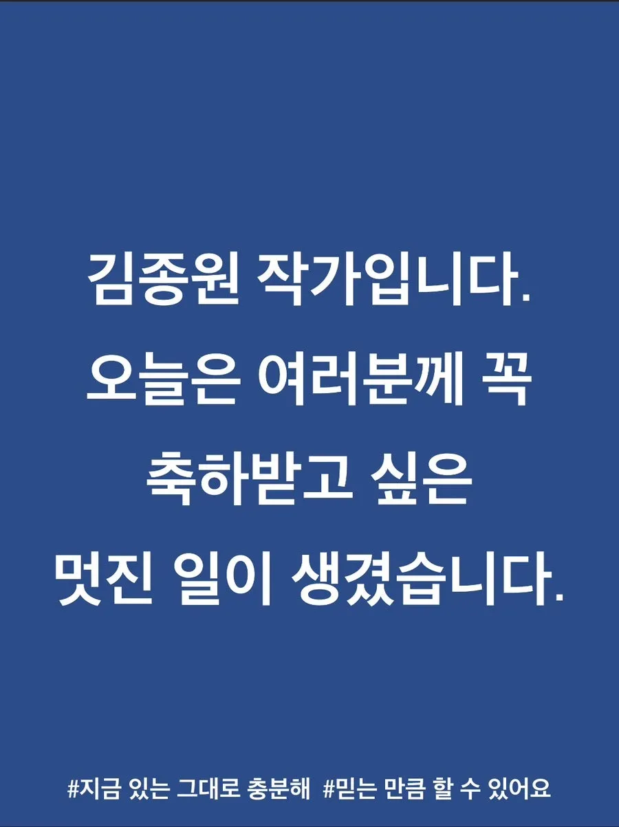 김종원 작가입니다. 오늘은 여러분께 꼭 축하받고 싶은 멋진 일이 생겼습니다.