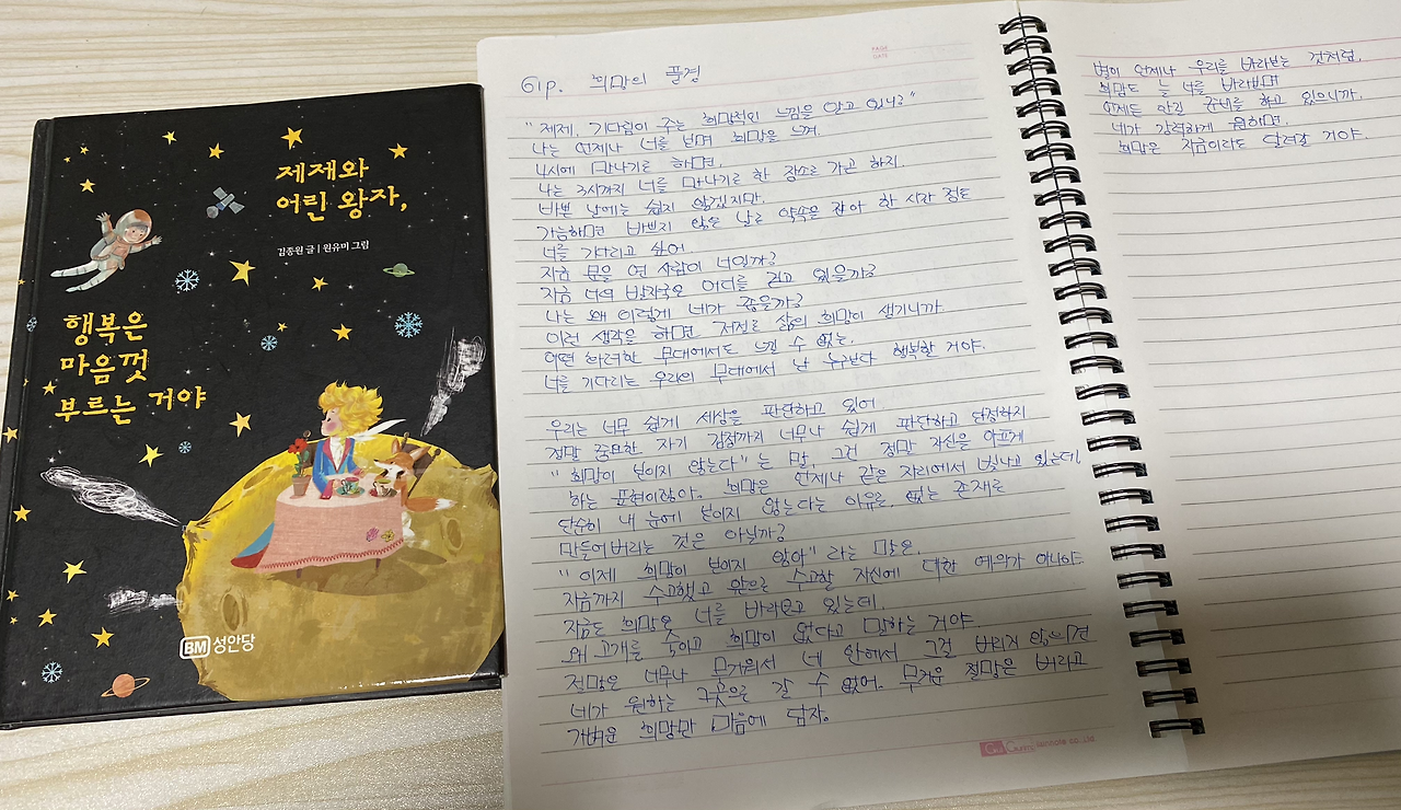 엄마가 병원에서 오기 전에 아이는 필사를 마쳐 두었고 학원을 다녀와 저녁식사를 마치고 하루 한 장 365 인문학 달력 낭송 녹음까지 끝낸 상태라는 일이 늘 엄마의 마음으로 들어와 힘과 용기를 생기게 한다. 일상의 별 길이 그리 멀리 있는 게 아니며 늘 우리의 주변이 별길이며 별들의 언어이기에 그 마음을 무수히 펼치며 이렇게 자신의 길을 걷는 일이 일상에서 간직하는 뜨거운 삶의 온기이며 살아갈 날의 아름다운 꿈이고 자본이다.