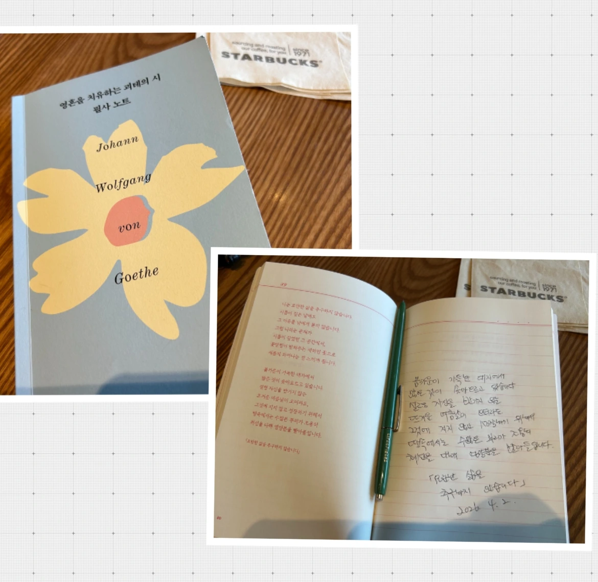 인간이 살며 만나는 시름, 꽃받침, 봄, 글과 삶들이 괴테가 쓴 시 한편속에 농축되어 있으니 여름과 봄 겨울이라는 계절에 질문해 자연과 대지를 넘나드는 생각하는 자의 꿋꿋한 기개가 글되어 펼쳐진다. 살아갈 날들을 위한 괴테의 시 중 요란한 삶을 추구하지 않습니다 를 필사하며 내 주변과 공간의 언어를 미숙하나마 대면한다.