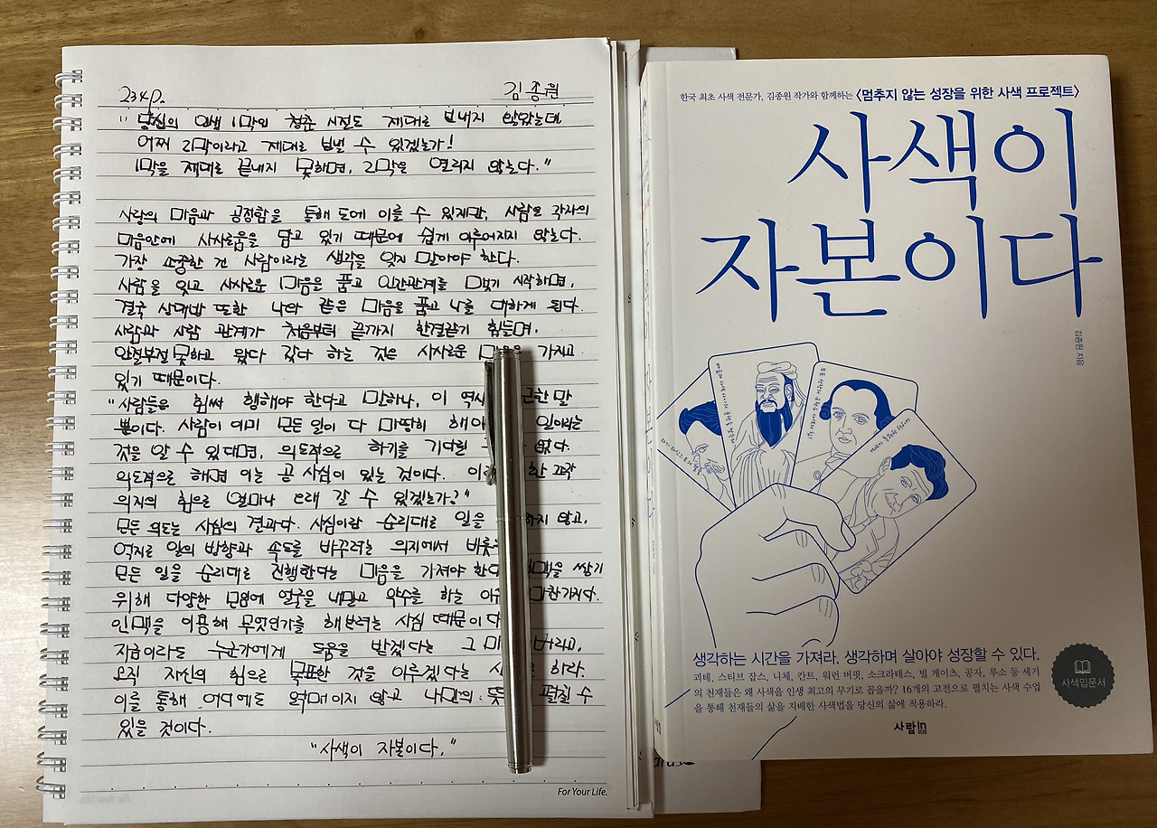 둘째와 큰 아이의 정겨운 대화가 밤 어둠을 지나며 같은 공간에서 바라보는 함께이지만 각자의 숲으로 걸어가듯 하던 일에서 잠시 멈추고 자기 안으로 들어가는 인문학 여행의 시간이 될 수 있다. 그렇듯이 세상의 모든 풍경은 늘 우리 가까이에 존재한다. 지성이 이끄는 내 삶의 평범하나 특별한 행복을 중심에 두고 ‘진실’ 과 ‘본질’.의 사랑을 찾아 떠나는 아이와 어른이 만들어가야 할 실천자의 마음이 바로 인간이라서 할 수 있고 찾을 수 있는 ‘사색’ 과 ‘문해력의 힘’ 이며 ‘자본’ 이 되는 거니까.
