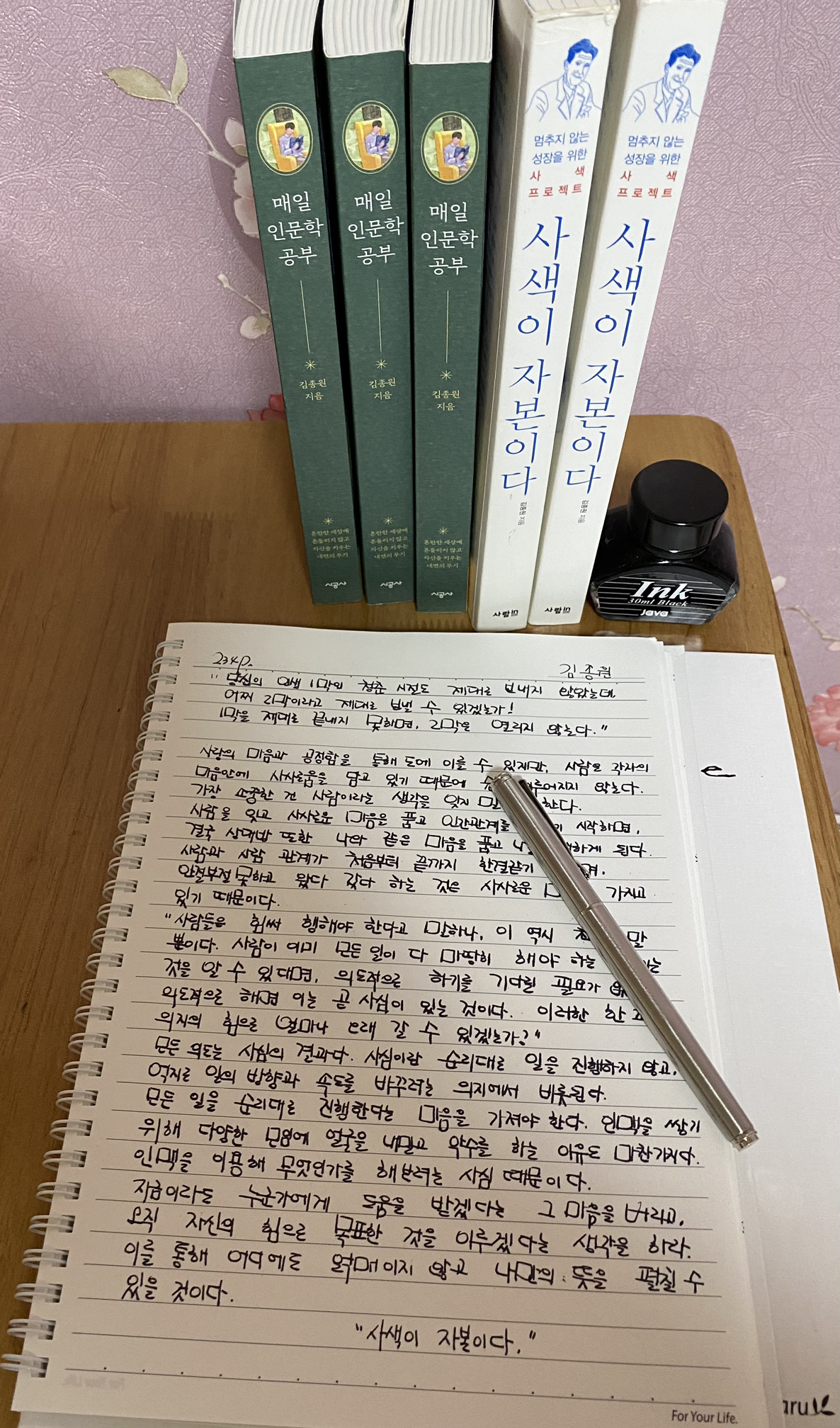 아이의 단어 쓰기와 받침이 가끔 귀엽게 틀릴 때가 자주 있었는데 최근 들어 만년필로 필사하는 아이의 문장에서 쓰기의 틀린 표기가 이제는 없다는 사실을 찾아볼 수가 있다. 애써 고치라고 말하지 않아도 연필로 하는 필사가 아닌 펜으로 하는 필사를 하며 차라리 글을 쓰는데 자연스러워졌다는 사실이 바로, 스스로 알게 되는 ‘국어공부’ 이며 집에서 스스로 하는 ‘독서’ 이며 ‘글쓰기’ 라는 귀한 사실을 실감할 수밖에 없다.