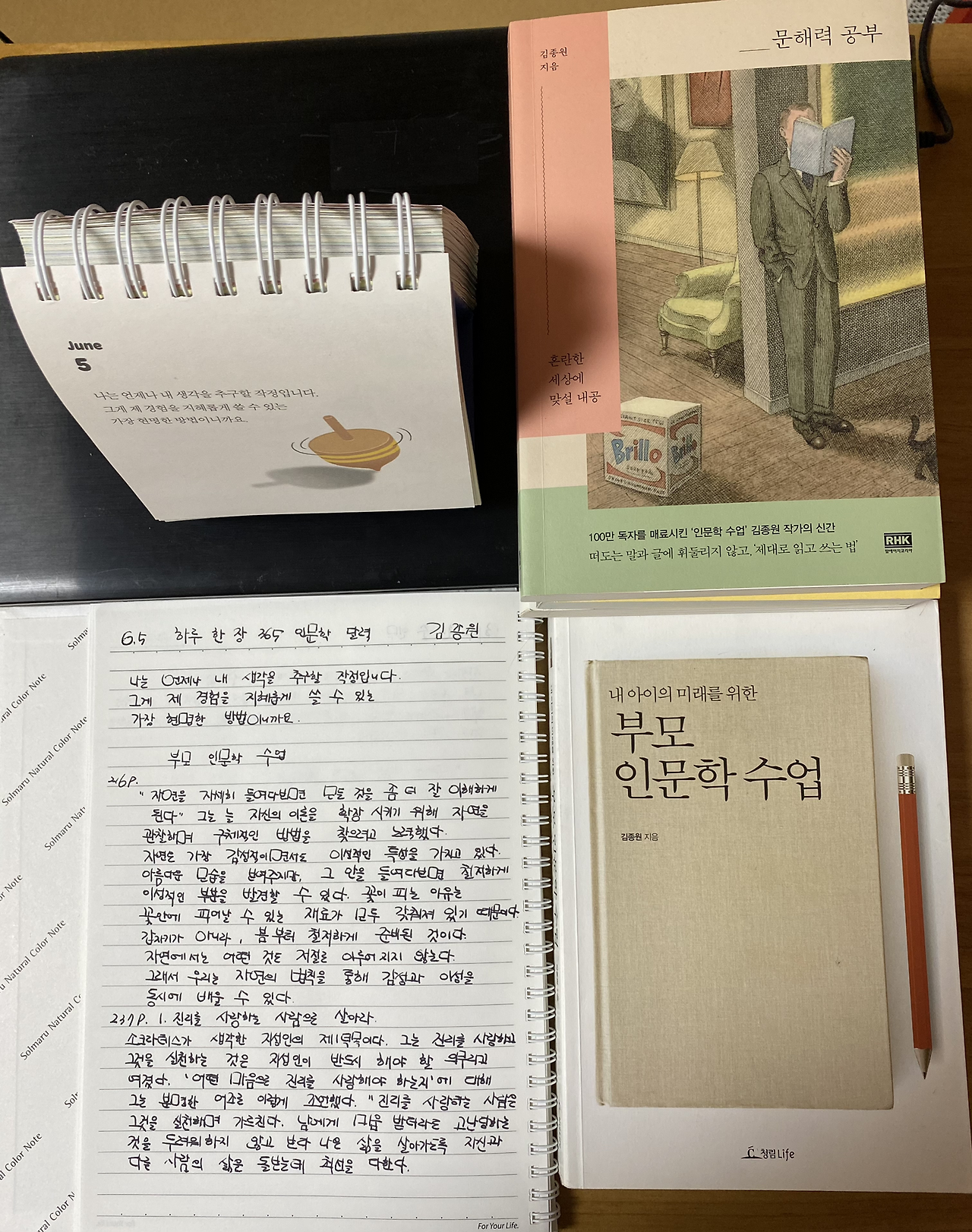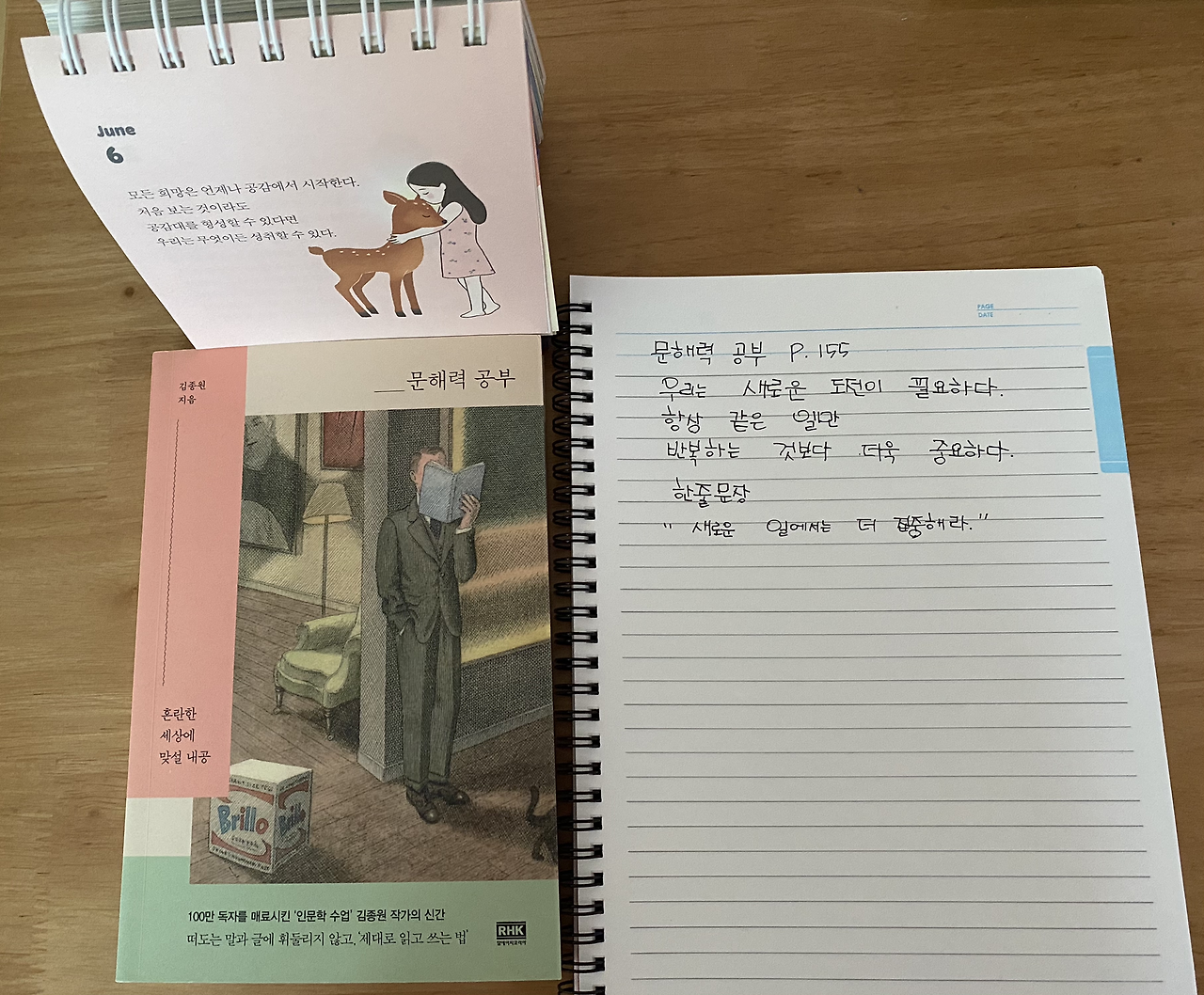 중간중간 혼자서 울어버린 흔적이 손등에 만든 모래집처럼 부어버린 엄마의 눈두덩이를 보고 아무도 묻지는 않을 만큼 아이들의 내면이 성장했다. 둘째는 틈틈이 내 어깨를 주무르기도 하고 필사하며 내게 일상적인 질문을 자주 하고 평소보다는 더 언어를 전하며 따스한 마음으로 엄마를 고요히 바라볼 줄 안다. 큰아이는 잠시 산책을 다녀오는 길에 사 온 크로와상 빵을 내게 건네며 이렇게 응수한다.