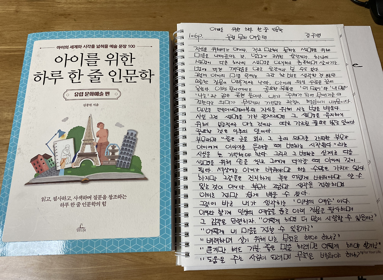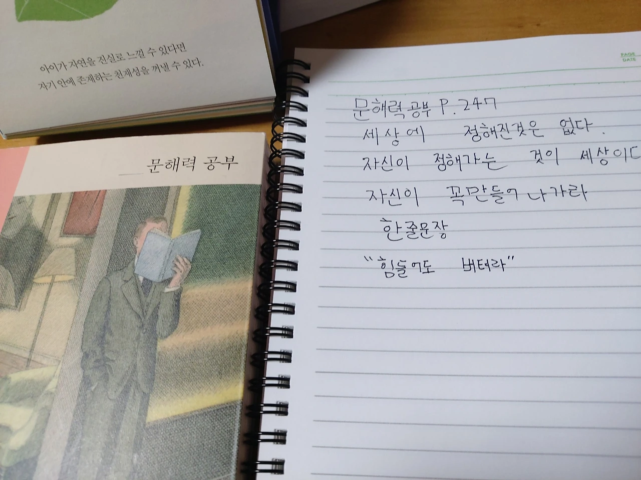 어제 아이가 필사를 하고 태권도장을 다녀와서 읽었던 책을 다시 읽고 생각하는 시간을 가질 수 있었다. 이유는 어제 아이가 필사를 하며 느낀 생각을 다시 한번 느껴보고 싶었기 때문에 한가한 시간을 빌어 내 생각을 아이에게 전하기 위해 잠시 노크를 했다.