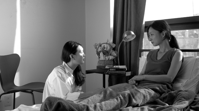 한 배우가 있다. 영화의 시사회를 앞두고 뇌졸중으로 쓰러진 그를 감독과 동료배우들이 방문한다. 침대에 누워 있을 뿐인 배우와 방문객들의 대화가 이어진다. 대화들은 종종 앞선 대화를 부정하거나 반박하고, 완전히 다른 긴장의 대화로 연결되기도 한다. 많은 세계들이 뒤섞여 있는 것만 같다. 그들이 대화를 청하는 대상은 한 명이지만, 동시에 각각의 대화는 서로 다른 연결점 속에서 각각의 세계들로 존재한다. 여기까지만 이야기하면 홍상수의 아류처럼 느껴질 수도 있지만, <우리와 상관없이>는 세계들을 맞부딪히고 거기서 산출되는 결과물을 관찰하는 듯한 홍상수와는 다르게 세계들 사이에 존재하는 근본적인 불안을, 나와는 다른 세계라 여길 타인과 마주함과의 긴장을 담아낸다. 침대의 배우와 방문객 사이의 대화로 채워진 1부와 달리 2부는 어떤 젊은 커플과 중년 여성의 이야기를 담아낸다. 이들이 속한 2부의 세계 또한 단일하지 않다. 반복되는 상황은 차이를 생산하고, 차이는 분열의 불안으로 이어진다. 마치 끊임없이 주사위를 던지며 결과들의 조합을 살펴보는 것처럼, <우리와 상관없이>는 가능한 조합들을 시험하고, 실험한다.