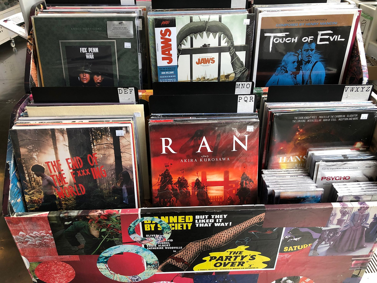 BFI 사우스뱅크 샵에서는 블루레이와 DVD 외에도 다양한 제품들을 판매한다. 먼저 눈에 들어온 것은 블루레이 매대 옆에 있던 티셔츠들이다. 벨라 타르, 브라이언 드 팔마, 베르너 헤어조크 등 여러 거장들의 이름이 마치 헤비메탈 밴드의 티셔츠 같은 디자인으로 적혀있다. 감독의 팬이라면 한 장 정도는 사고 싶은 센스 있는 디자인이다. 옆에는 각종 영화의 OST 음반을 판매하고 있었다. CD뿐만 아니라 LP로 발매된 음반이 대부분이었다. 스티븐 스필버그의 <죠스>(1975), 구로사와 아키라의 <란>(1985), 오슨 웰즈의 <악의 손길>(1958) 등의 LP가 눈에 띈다. 게다가 올해 넷플릭스를 통해 공개된 드라마 <빌어먹을 세상 따위>(2018)의 LP 또한 있는 것 역시 흥미로웠다. 드라마 OST가 LP로 발매되는 곳이라니, 영국은 역시 덕질 하기엔 최적의 공간이다. 어느 샵을 가도 있는 엽서는 이 곳에도 있었다. 오른쪽 사진 아랫줄에 위치한 엽서들은 여러 영화를 10년 단위로 묶은 세트이다. 옆 매대에는 더욱 다양한 종류의 영화 엽서들이 있었다. 사진 위 쪽의 두 줄은 영화 스티커이다. 맨 윗 줄에는 영화와 관련된 여러 인물들, 가령 셜록 홈즈나 제인 오스틴 등의 스티커가 있고, 그 아랫줄에는 미국 드라마 <스타트랙>의 캐릭터 스티커들이 있다. 미국 드라마의 캐릭터 스티커가 영국이 있다는 것도 약간 신기한데, 출시된 스티커의 종류도 많아 새삼 놀라기도 했다.