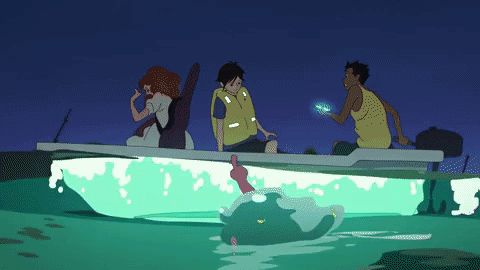 2. 액체, 특히 물은 생명의 상징으로 다뤄진다. 청명한 푸른색의 물은 장르를 가리지 않고 다양한 시각예술에서 그러한 상징으로 다뤄졌다. 유아사 마사아키의 <새벽을 알리는 루의 노래>를 떠올려보자. 햇빛에 닿으면 화상을 입고 죽게 되는 인어인 루는 바다에서 살고 물을 움직일 수 있는 능력을 지니고 있다. 물은 인어들의 생명의 근원이자 힘이다. 루가 그 힘으로 카이와 친구들을 수차례 구하는 장면이 등장하기도 한다. 동시에 해안가 마을로 밀려오는 해일은 더이상 생명이 아니다. 침수된 마을은 곧 폐허이다. 생명과 죽음이라는 단순한 이분법은 '물'이라는 이미지, '액체' 이미지의 핵심이다. 고정되지 않고 흐르는 액체들은 영화 내 운동을 추동하고, 형상을 기록하는 복제예술인 영화에 고정되지 않는 형상을 제공한다.