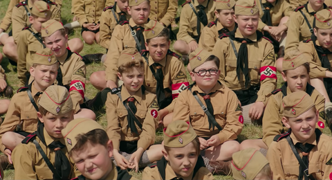 영화의 예고편을 봤을 땐 <토르: 라그나로크>보단 그 이전의 영화들이 떠올랐다. 히틀러가 상상의 친구인, 인정받지 못하는 2차 대전 당시의 독일인 소년이 주인공인 영화인 데다가, 대부분의 전작에서 직접 연기를 선보였던 타이카 와이티티가 직접 히틀러를 연기한다는 점이 그의 팬들을 기대하게 만들었다. 영화의 초반부는 그런 기대를 가득 채워준다. 예고편을 통해 엿볼 수 있었던 나치 소년단 캠프에서의 좌충우돌, 조조와 상상의 히틀러가 대화를 나누는 어처구니없는 상황, 언제나 아이러니를 품은 전쟁이라는 상황까지 많은 것이 흥미롭게 보인다. 게다가 상이군인인 클렌젠도프(샘 록웰)가 이끄는 나치 소년단은 스카우트 캠프를 소재로 삼은 웨스 앤더슨의 <문라이즈 킹덤>을 연상시킨다. 그 영화에서 끌어온 것 같은 숏의 구도들은 ‘나치 문라이즈 킹덤’이라는 독특하고 이질적인 만남을 기대하게 한다.