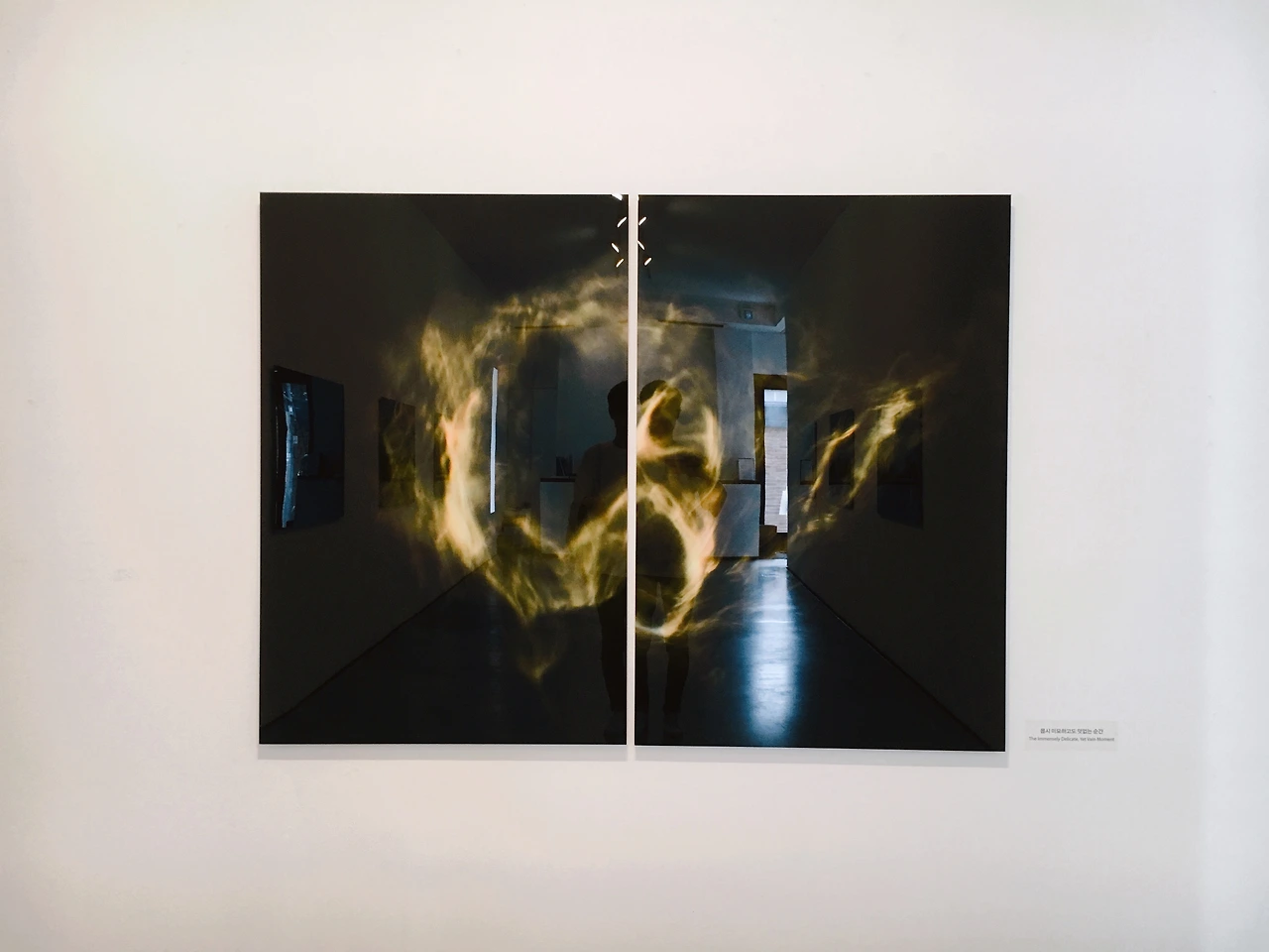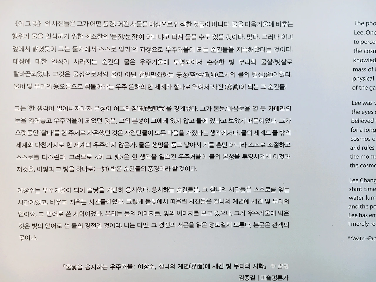 흘러가는 물에 반사되는 빛의 모습을 촬영한 사진들을 전시해 놓았는데, 몇몇 사진과 작품 설명으로 해석하자면 '물은 우주 만물을 담고 있다.'라는 것을 말하고자 하는 것 같았습니다.