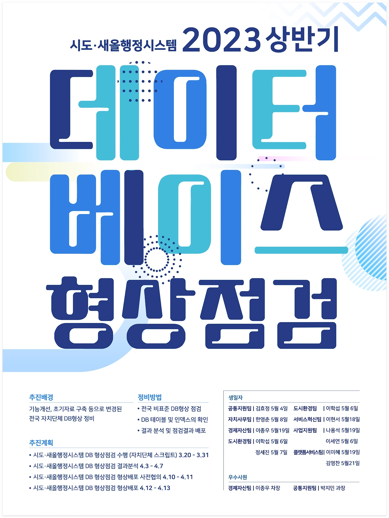 먼저, 포스터에 필요한 내용을 전달받습니다. 받은 내용을 읽어보며 어떤 내용인지 살펴보고 중요한 부분이 무엇인지 파악합니다. 저는 제목 <시도·새올행정시스템 2023 상반기 데이터베이스 형상 점검> 중 ‘데이터베이스 형상 점검’이 중요하다고 판단해 크기로 위계를 만들어 강조했습니다.
