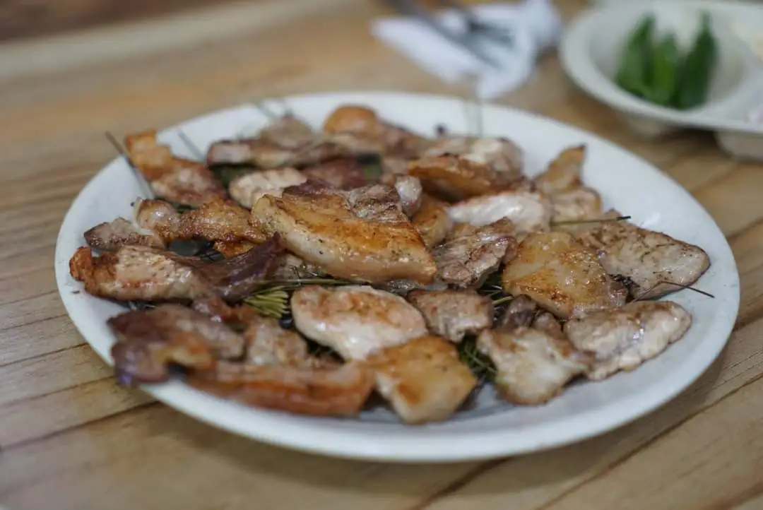 나를 데리고 간 부부가 마르고 달도록 칭찬하던 숯불돼지갈비를 주문했다. 오리지널과 양념 두 가지 맛이다. 찬이 깔리고 주섬주섬 집어먹는 도중에 잘 구워진 고기가 나왔다. 공깃밥을 먹을 거냐고 묻기에 고기 먹을 땐 밥을 먹지 않는다는 고기인의 의지를 표명했다. 솔잎에 올려진 고기에서 좋은 향이 났다. 숯과 솔이 돼지고기가 가진 특유의 기름향을 우아하게 꾸며주었다.