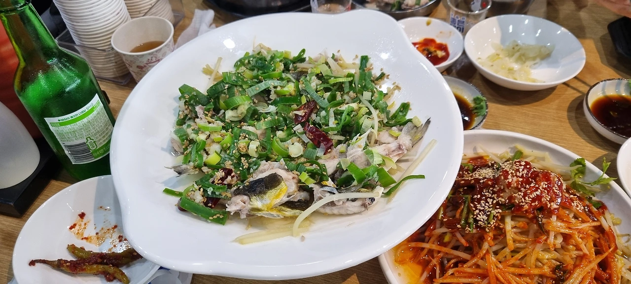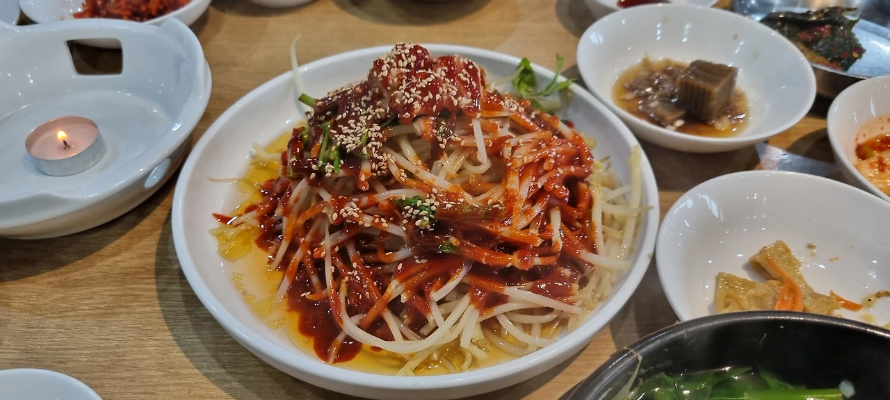 뚝배기가 반쯤 비어갈 때쯤 복어수육과 마늘콩나물무침이 나왔다. 젓가락을 들고 콩나물 무침을 잘 버무린다. 얼굴이 빨개졌다는 말에 알코올이 부족해서 그렇다고 둘러대고 얼른 한잔을 털어 넣었다. 매콤하고 알싸한 콩나물무침은 안주로도 잘 어울린다.