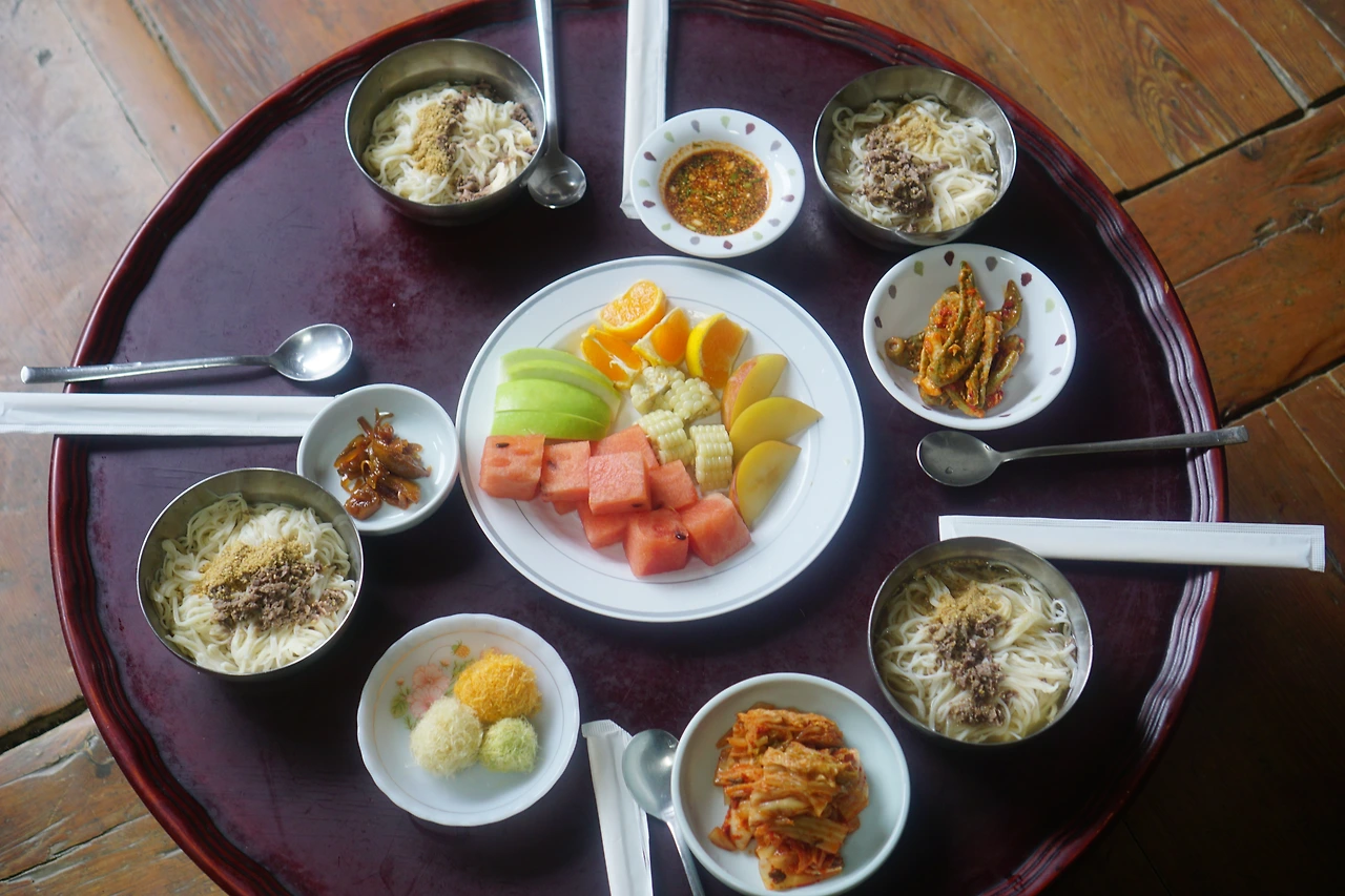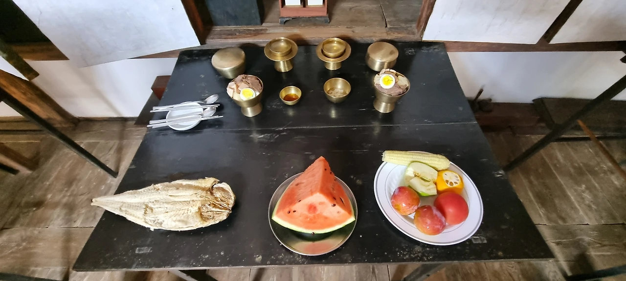 건진국수, 김치, 북어보푸라기, 과일이 올려짐 손님의 음복상. 사진엔 나오지 않았지만 감자탕이 추가되었다.