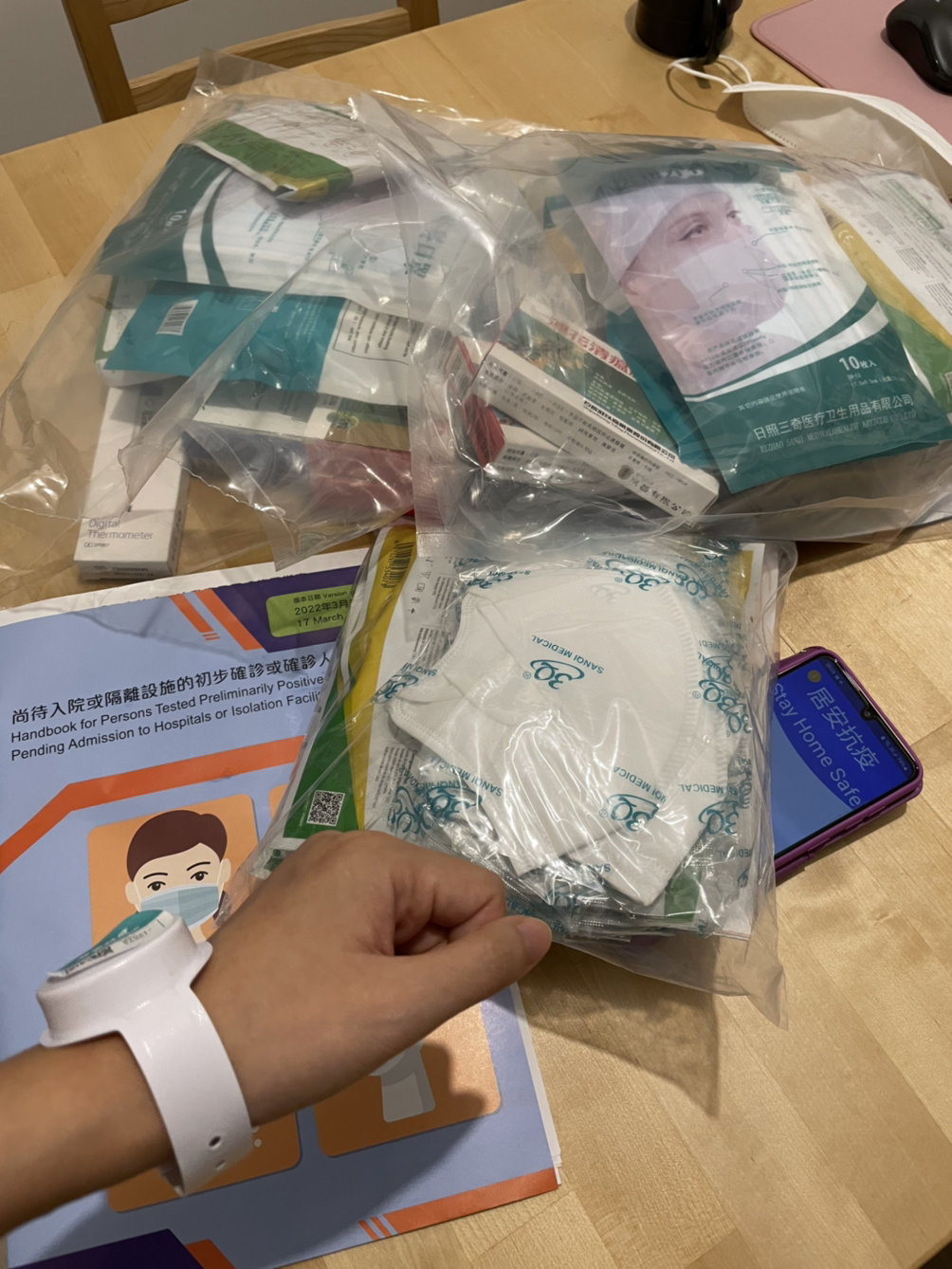 홍콩 정부 지침에 따라, 온라인으로 양성 확진 신고를 하니 당일 저녁 보건국 직원이 집으로 파견됐다. 아파트 매니지먼트 관리자와 함께 방역복을 입은 직원 한 명이 신속항원검사 키트와 코로나 약, 체온기 등이 가득 든 봉투 여러 개를 전달해줬고, 전자 팔찌를 직접 채워줘 StayHomeSafe 앱에 등록 해줬다. 전자팔찌를 찬다고 하니 한국의 성범죄자 전자 팔찌가 연상되어 기분이 묘했다. 이 팔찌를 채우면서 다시 나의 7일간의 격리는 리셋이 되었다. 호텔 격리를 마치고 6일 만에 다시 격리가 시작됐다.
