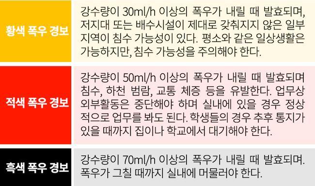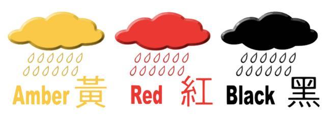 홍콩은 국지적 호우(스콜)가 자주 발생하기 때문에 태풍 경보 시스템 외에도 폭우 경보 시스템도 있다. 폭우 경보 시스템은 황색(Amber), 적색(Red), 흑색(Black) 경보, 3단계로 구분돼 있다.