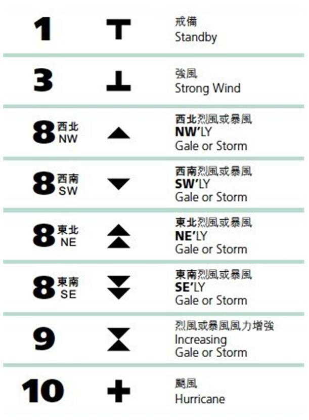 홍콩 태풍 경보 시스템은 1917년에 도입되었으며, 다음과 같은 총 5단계의 경보 시그널이 있다. 숫자가 커질수록 태풍의 강도가 더 세다.