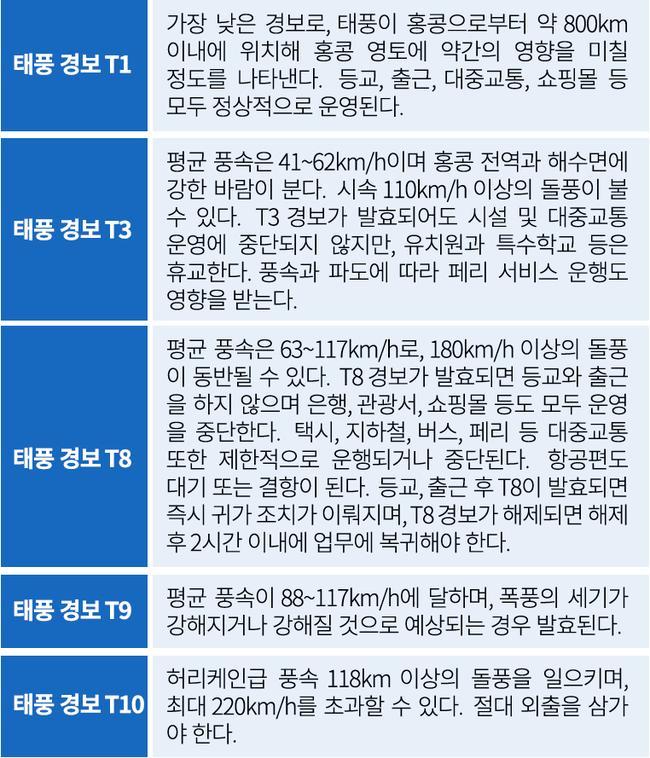 홍콩 태풍 경보는 T1, T3, T8, T9, T10까지 총 5개가 있다. T9나 T10은 매우 드물게 발효된다. 가장 최근에 홍콩을 강타했던 T10은 지난 2018년 9월 태풍 망쿳 때였다. 당시 고층 건물의 창문이 깨지고, 커튼이 비바람에 창밖으로 휘날리는 영상이나, 건물 외벽에 설치된 대나무 비계가 뜯겨나가는 영상, 사람이 강한 비바람에 몸을 가누지 못하고 휩쓸려가는 영상들이 소셜미디어를 도배했을 정도로 홍콩 역사상 가장 파괴력이 강한 태풍 중 하나로 기록됐다. 가장 기억에 남는 태풍을 말하라면 당연히 태풍 망쿳을 가장 먼저 떠올리게 될 정도로, 개인적으로도 가장 무서웠던 태풍이었다.