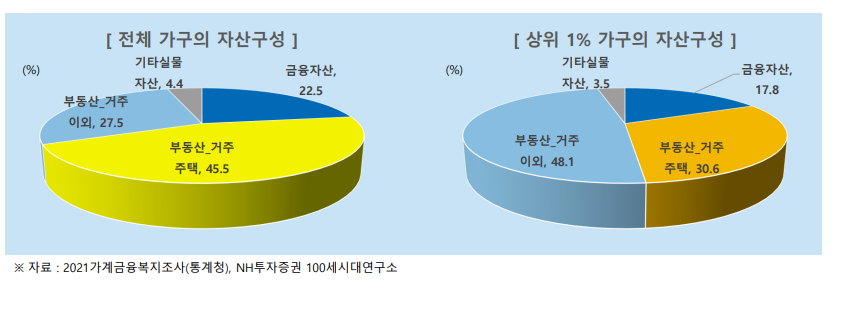 또한 상위 1%의 자산형태는 실거주를 제외한 부동산자산비율이 48%로 일반 가구들 보다 높았으며, 금융자산의 경우 일반 가구들은 해당 비율이 높은 것과는 달리, 상위 1%의 경우 약 17% 만이 금융자산인 것으로 나타났다. 즉, 일반가구들은 자신이 거주 중인 자가가 자산의 큰 비중을 차지하고, 그 이후로는 금융자산 (주식, 예금, 증권)인 반면, 상위 1%의 경우, 거주 중인 자가 이외의 추가적인 부동산을 통한 자산비율이 높으며, 금융자산은 17% 정도로 일반가구보다 비율이 낮았다. ( 단, 통계적으로 볼 때, 상위 1% 부자들의 17%는 최소 4억 9천3백으로 여전히 비율로 낮은 것이지 절대적으로 적은 금액은 아니다.)