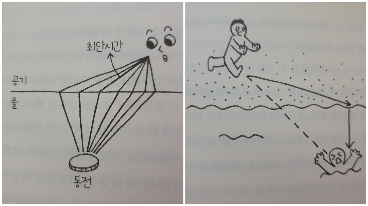 당신은 빛의 굴절을 인과적인 측면에서 바라보는 데만 익숙해 있어. 수면에 도달하는 것은 원인이고, 그 방향이 바뀌는 것은 결과라는 식이지. 페르마의 원리가 이상하다는 느낌을 받는 건 빛의 행동을 목표 지향적인 표현을 써서 묘사하고 있기 때문이야. 마치 광선에 대한 계명의 느낌이랄까. '네 목표로 갈 때는 도달 시간을 최소화하거나 최대화할지어다' 하는 식으로 말이야." (<당신 인생의 이야기> p.199-200)