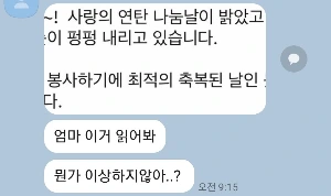 메시지가 좀 깨져서 안 보이는데, 요는, 사랑의 연탄 봉사 날 눈이 와서 기쁘다~라는 주최 측 담당자의 메시지였다. 그리고 아들 눈에는 가뜩이나 추운 겨울에 눈까지 왔으니 봉사하는 동안 얼어 죽을 게 분명한데, '눈이 오다' 와 '축복'을 동급으로 놓은 이 문장이 당최 이해가 안 갔던 거다.