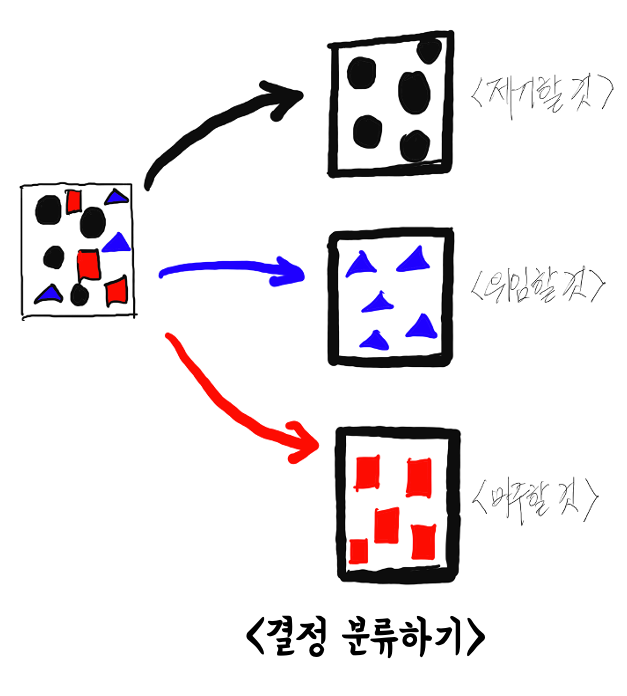 CEO나 리더가 내려야 할 수많은 결정들은 피하거나, 위임하거나, 마주 하거나의 세 가지 방향성으로 진행한다면 도움이 될 수 있다. 피할 수 있는 결정은 선별해서 제거해 나가고(사실 뭔가 새로운 것을 찾는 것보다 지금 하지 않아야 하는 것들을 찾아서 제거하는게 더 중요한 일은 경우가 많이 있다), 위임해야 할 결정은 바로 실행으로 옮기며 마주해야 할 결정은 물러서지 않고 마주하고 실행으로 옮겨야 한다. 여러 결정 중에서 세 가지를 먼저 분류하고 진행을 한다면 망설임을 줄일 수 있고, 효과적인 결정을 할 수 있는 가능성이 높아진다.