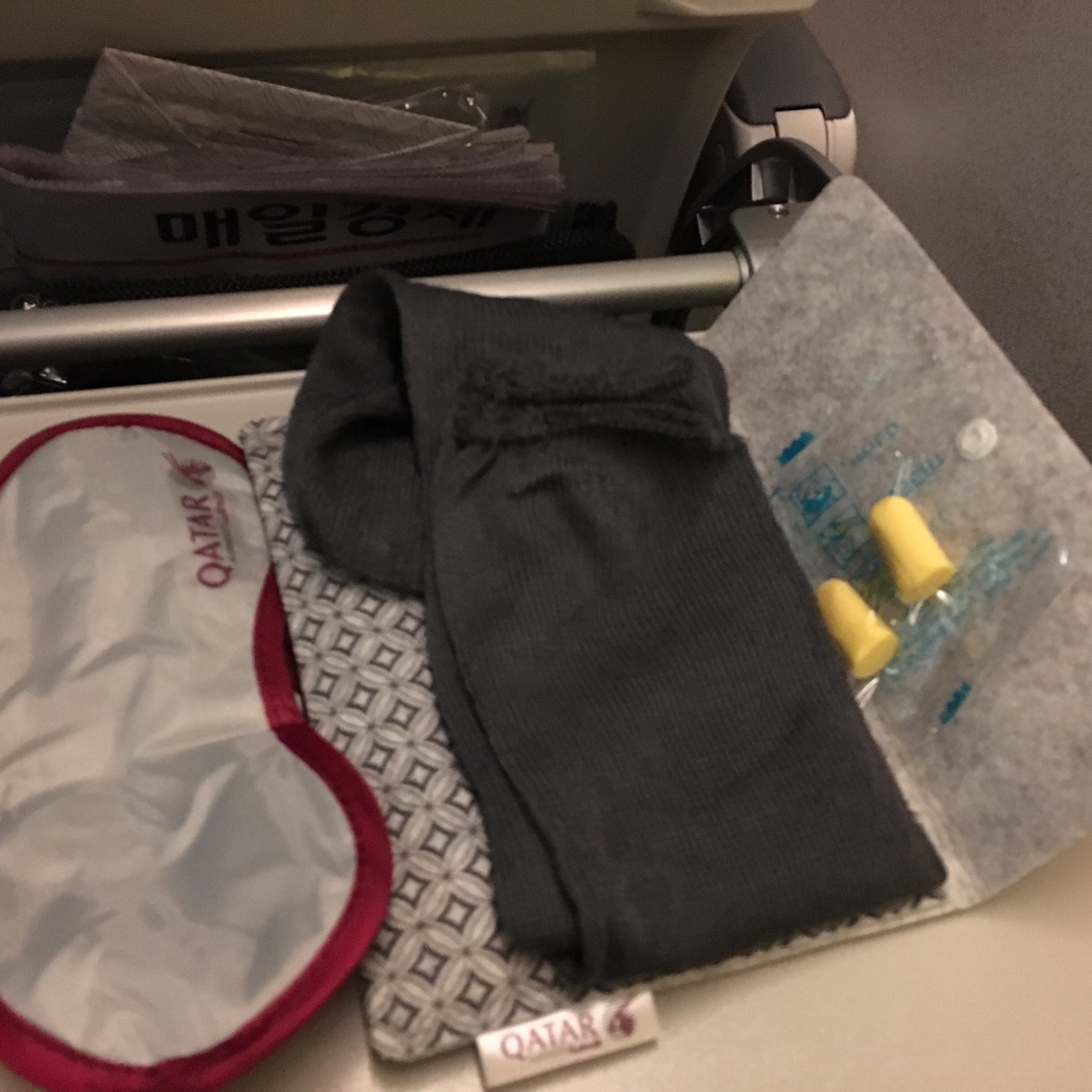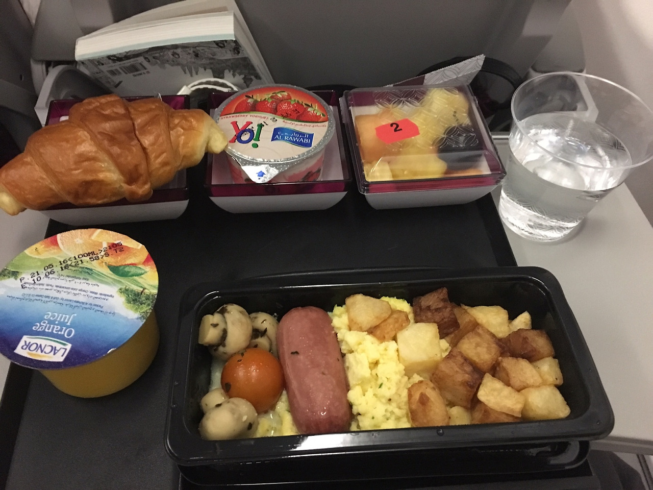 받자마자 물을 드링킹 했다. 기내 수분도 부족하지만 체내 수분은 급격히 메말랐다. 원샷하고 겨우겨우 오믈렛을 씹었다. 다행히 부드러웠다. 소시지도 괜찮았고 내가 좋아하는 버섯도 있으니 꽤 괜찮은 아침식사였다. 하지만 기내 사육은 지겨웠다. 자고 일어났더니 화장실도 참.. 용기 내 화장실을 갔다. 비행이 시작된 지 꼬박 6시간 만이었다. 3시간 만있으면 도하에 도착한다고 했다.