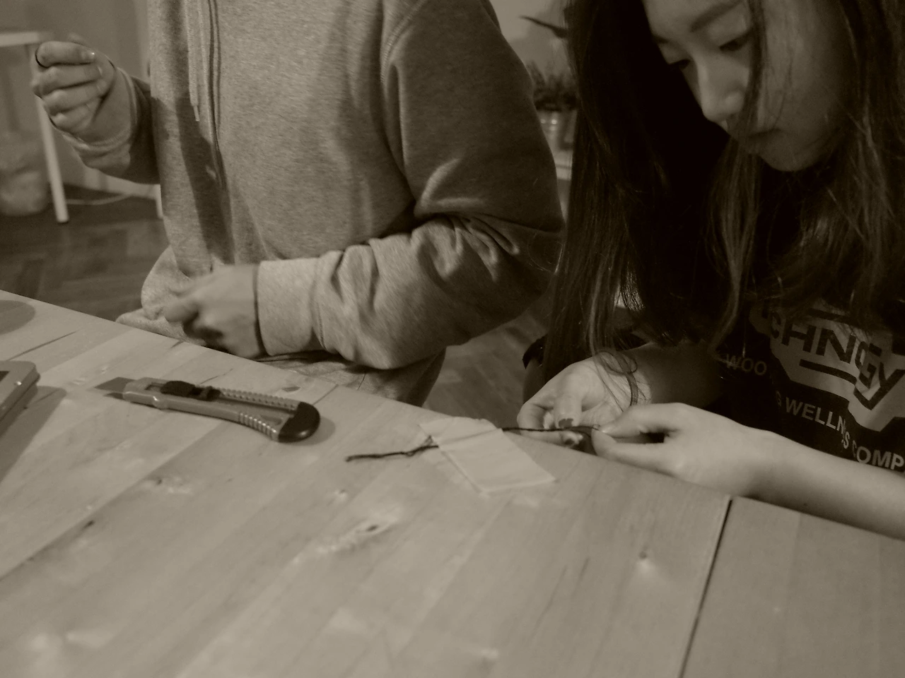 2. 맨 위에 매듭을 묶어 테이프로 테이블에 고정한 뒤,
