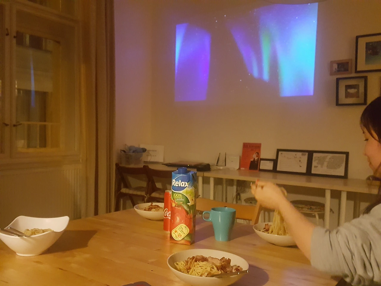 신재오빠가 주방에서 멋지게 웍을 흔들며 요리를 하고 있으면, 우리는 거실에 빔 프로젝터를 설치한다.
