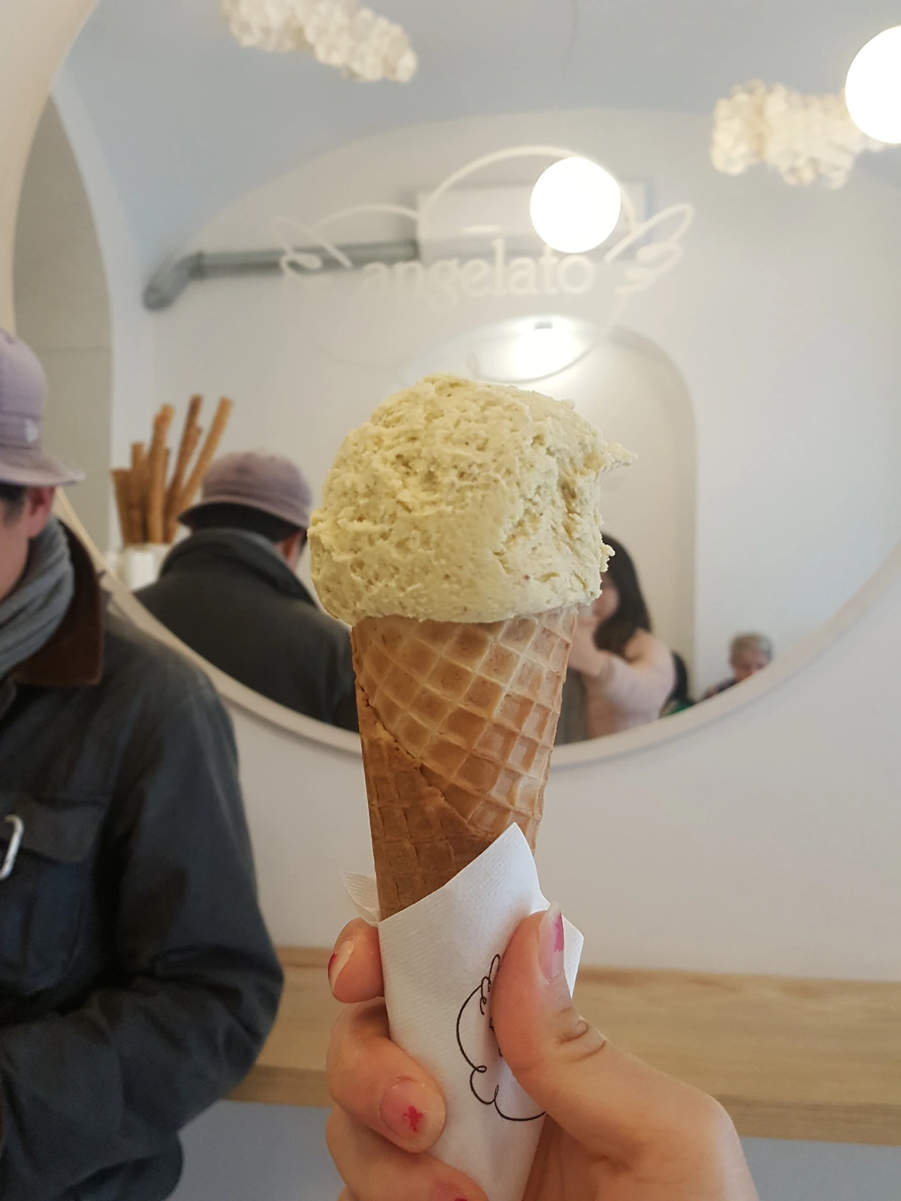 피스타치오 젤라또 하나, 초콜릿 젤라또 하나를 손에 꼭 쥐고 신이 난 걸음으로 다시 교회로 향했다.