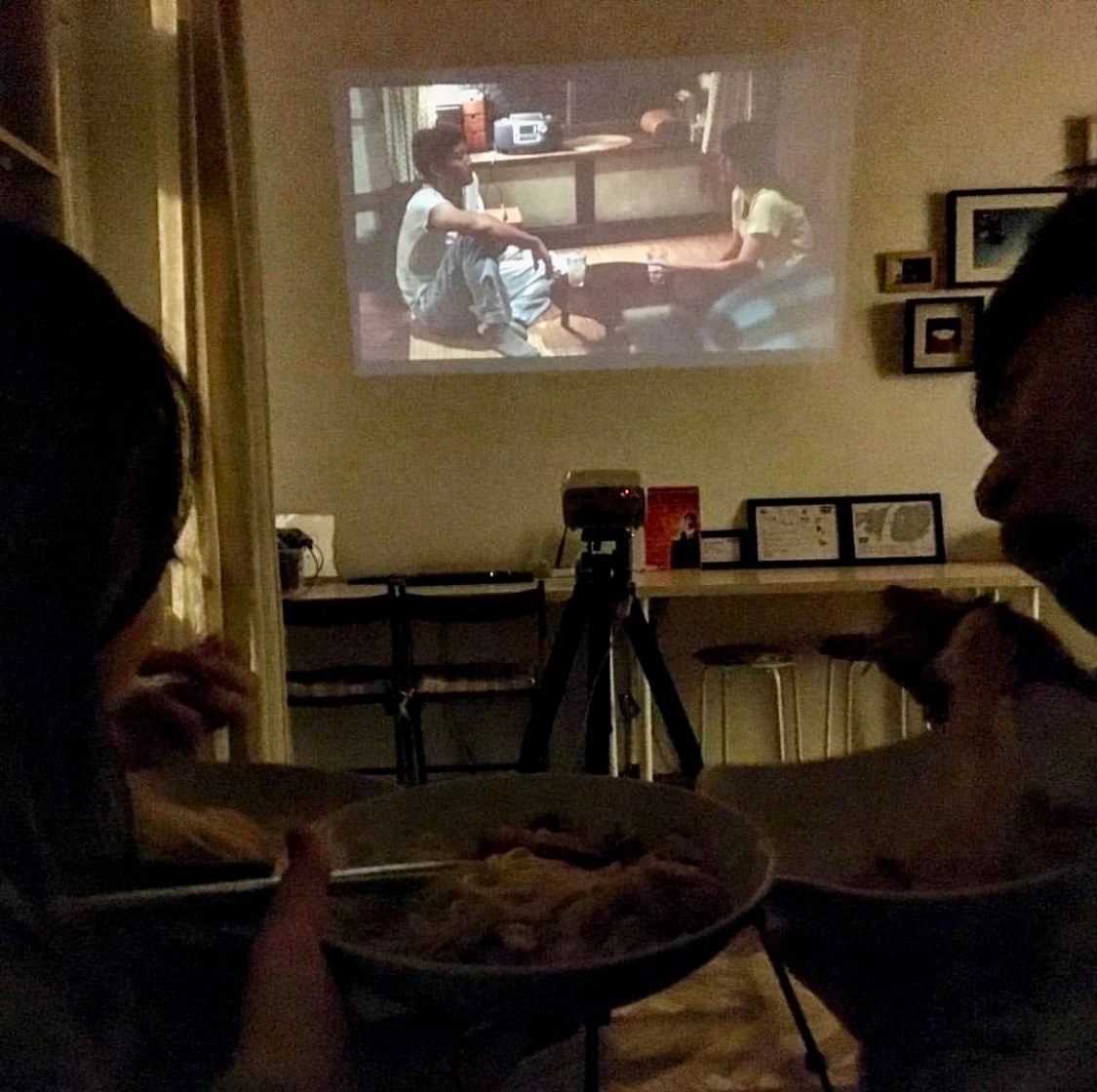 각자 파스타를 담은 그릇을 품에 앉고 의자 돌려 영화 리틀포레스트를 감상한다.
