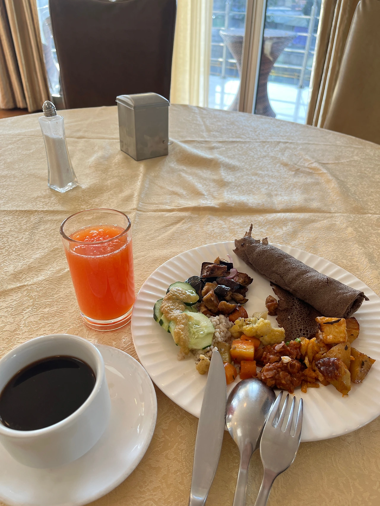 4성급 호텔이라고 했지만 역시 한국의 퀄리티와는 비교할 수 없었다. 그저 따뜻한 물이 나오고 편안하고 깨끗한 침대가 있다는 것에 만족했다. 그리고 아침 점심 저녁 모두 에티오피아 전통 음식을 준비해 준다고 했다.
