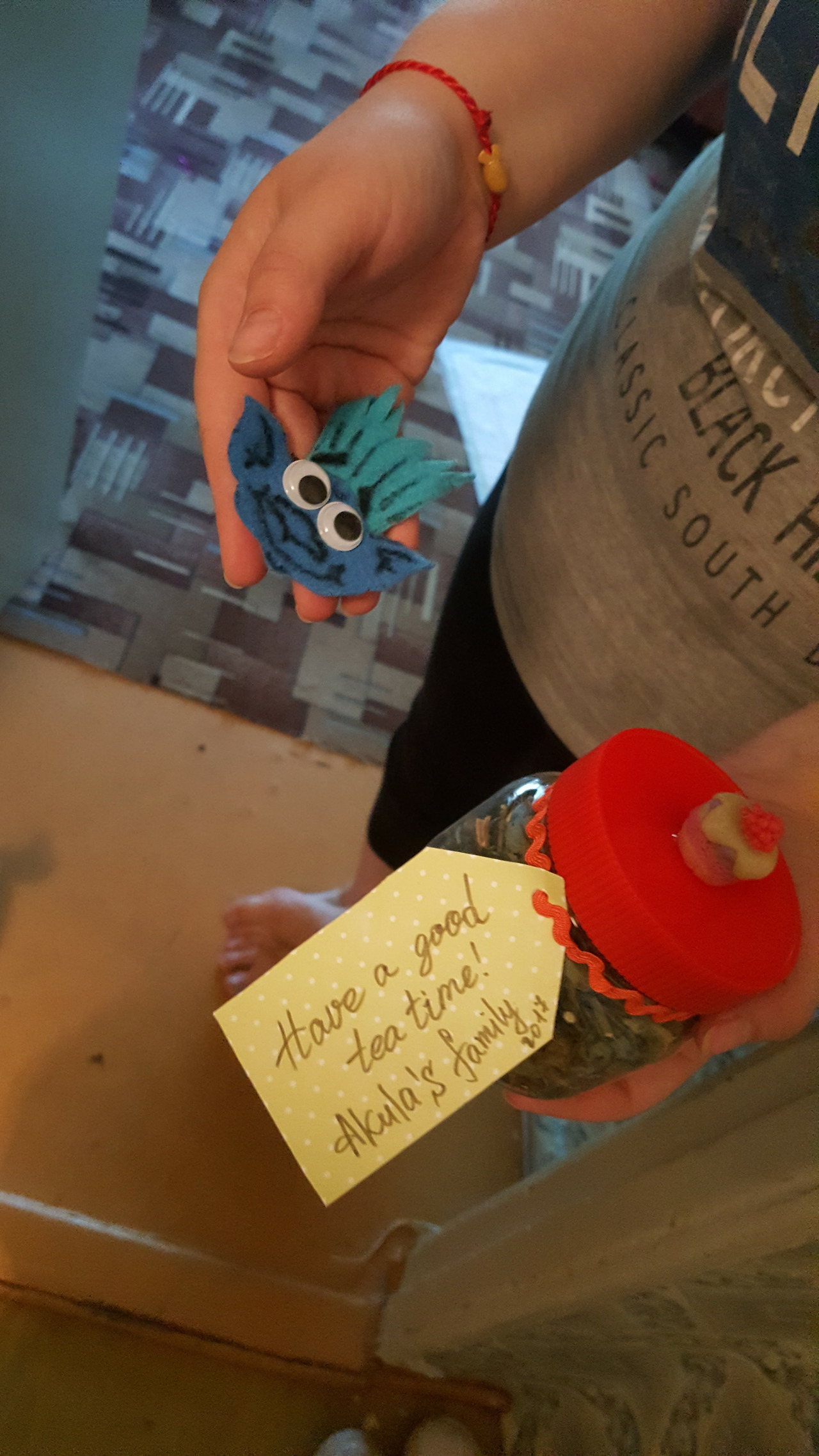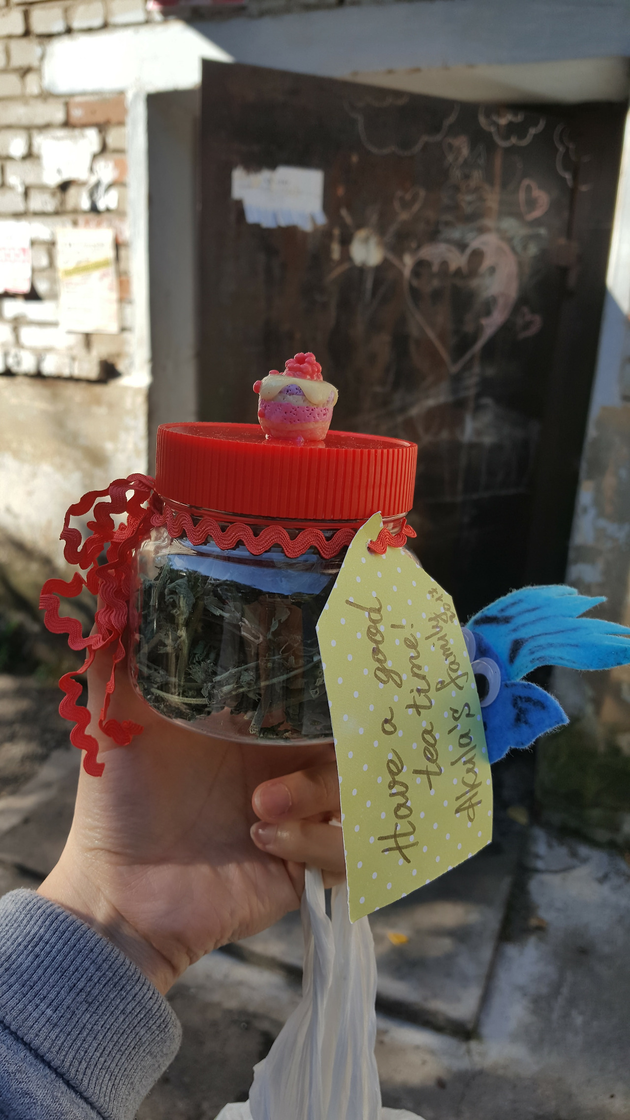 기차를 타러 가기 전, 집 문 앞에서 나탈리가 작은 찻잎 병과 귀여운 편지를 건넸다.