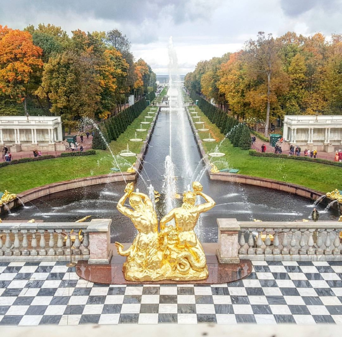 햇빛이 황금 조각상과 푸른 잔디를 비췄다.