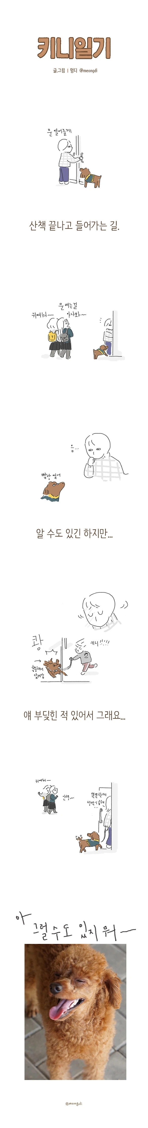 본업은 그래픽 디자이너. 취미로 그림을 그려요. 갈색푸들 키니와 함께하는 일상 <키니일기> 연재중. instagram @meongdi